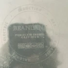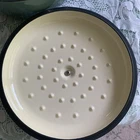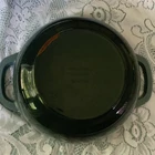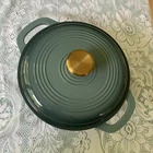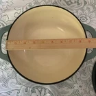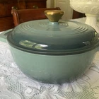 Beautiful cast iron Dutch oven made in Italy by brandani. Almost new condition. Please see all photos for the best description. Beautiful, gray, ombre color,, almost a celadon green. With handles, measures 11.5 inches diameter pot interior only measures 9 inches approximately 4 inches high without lid. The only issue on this cast iron beauty is it has a chip on the bottom as shown. This can be remedied by sealing with a protectant, if wished. Great piece of cookware for the price. Make offer now and own this beauty today.