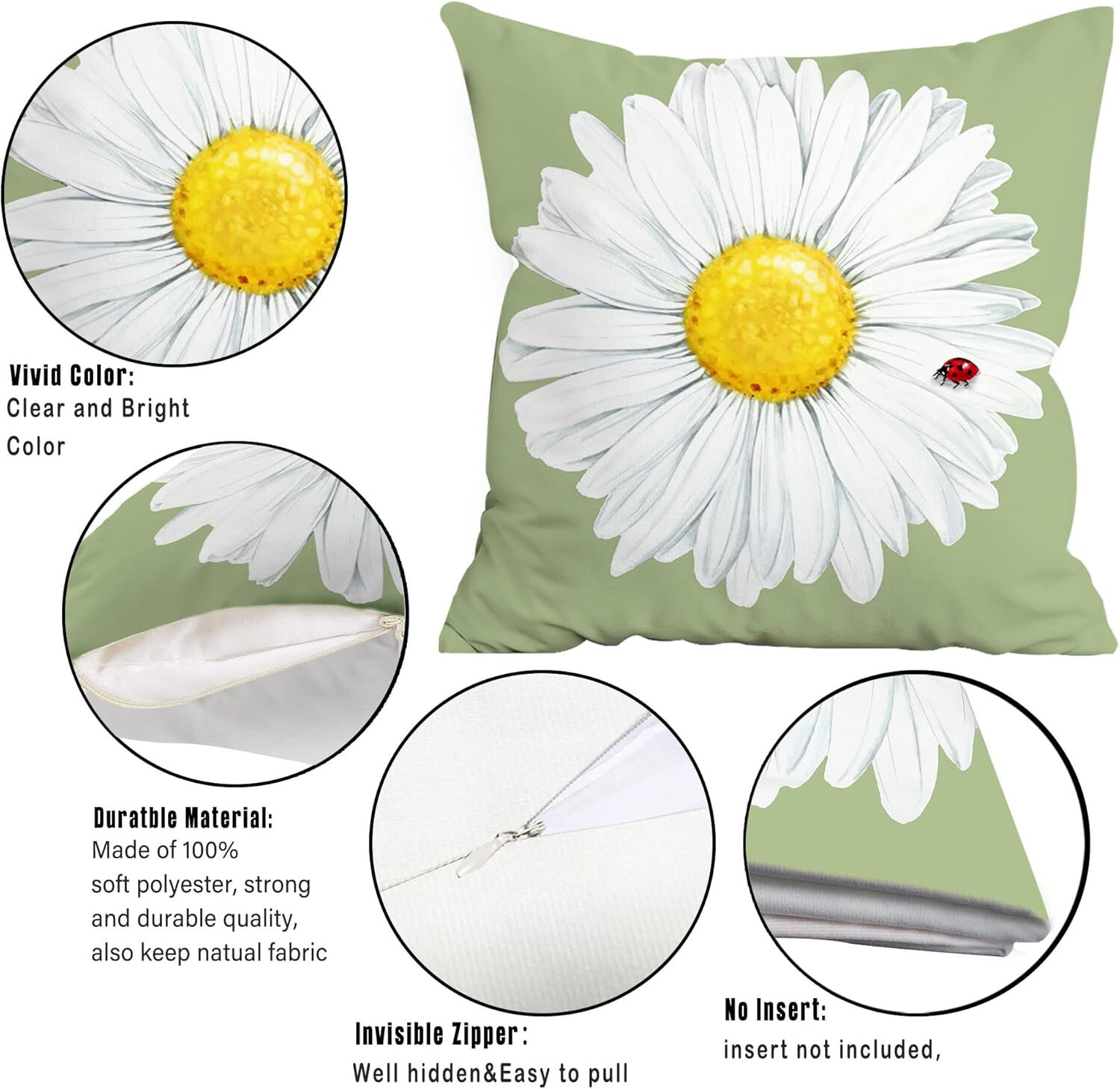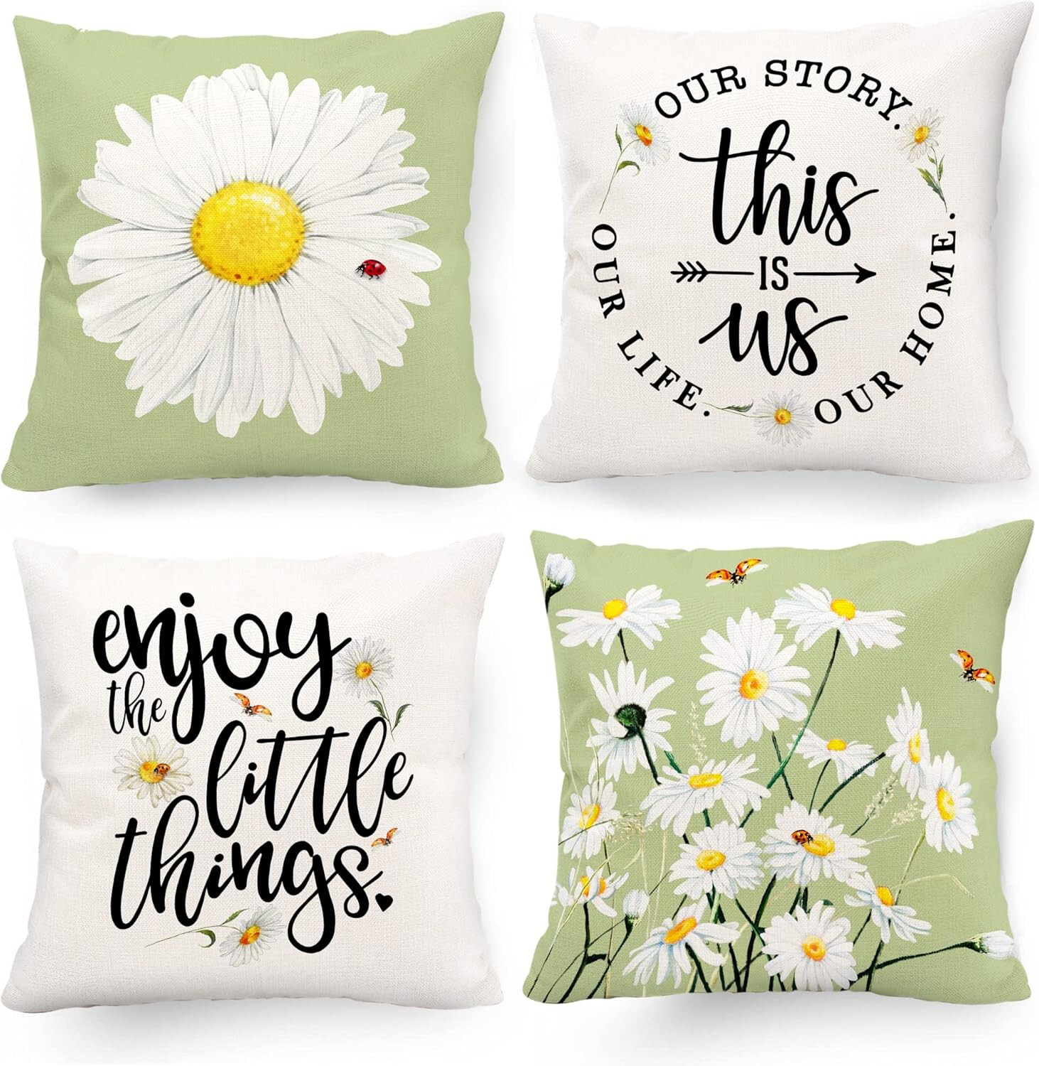 Spring Pillow Covers 18x18 : Made of soft polyester material, comfortable and durable. Beautiful spring daisy pillow covers fit for couch sofa patio bench living room indoor and outdoor spring summer decorations. GREAT VALUE FOR YOUR MONEY. Spring Summer Pillow Covers : Vivid light green color, beautiful daisy floral, and sentimental sayings are all clearly printed on this summer pillow covers 18x18, easily decor your home with vibrant and beautiful colors for spring summer decor. Pattern is as same as advertised. Perfectly spring pillows for holiday and party. GREAT ADDITION FOR HOLIDAY HOME DECOR. Green Spring Pillow Covers : Size: 18x18 inch, easy to put it on and off. Decorative green pillow covers set of 4 is an unique spring summer decorations, Can be applied for home decor at festival, spring, summer, also suitable for special parties and events. Ideal for Indoor Outdoor Home Decor. Washable & Colorful, Colors Keep Fresh As New : Washable in the cold water, dry it like other daily things, colors keep freash new, would not fade. Hidden zipper design helps daisy floral pillow covers looks more elegant and get lots of compliments. NOTE: ONLY PILLOW COVERS, PILLOW INSERTS ARE NOT INCLUDED. Decorative Green Pillow Covers Daisy Decor : Vibrant daisy floral, light green colors, sentimental sayings, would be a great decoration for home, decor your own living room, couch and sofa, outdoor porch patio bench. Rustic light green colors daisy flower pattern help u creating perfect holiday atmosphere, and get a lot of compliments.