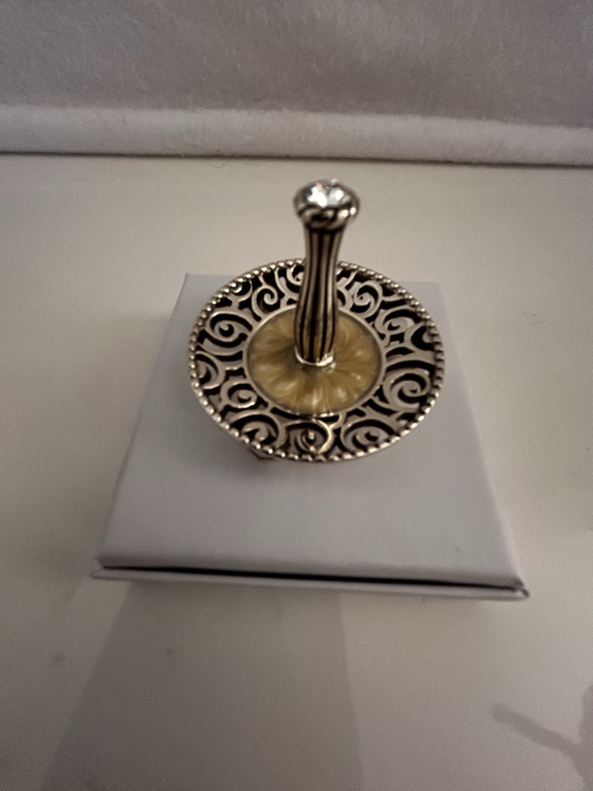 The Brighton Lacie Daisy Ring Holder is a vintage-inspired jewelry stand made of silver plate with a round shape. It features a mother of pearl base adorned with a Swarovski crystal, adding a touch of elegance to any ring. This unisex ring holder is approximately 2 inches in length and 1.5 inches in width, making it suitable for showcasing and organizing rings in a stylish manner. Made in the United States by the renowned brand Brighton, this jewelry stand is a perfect addition to any jewelry collection.