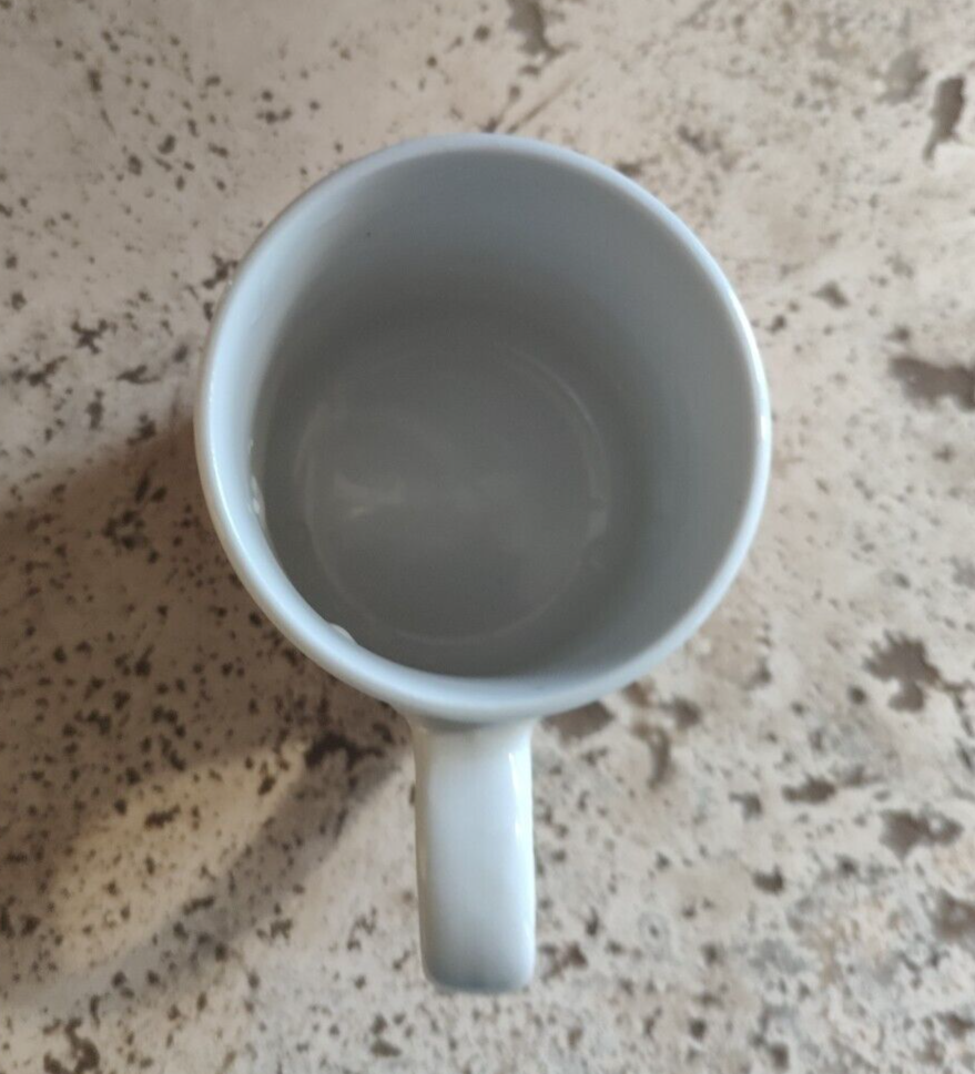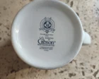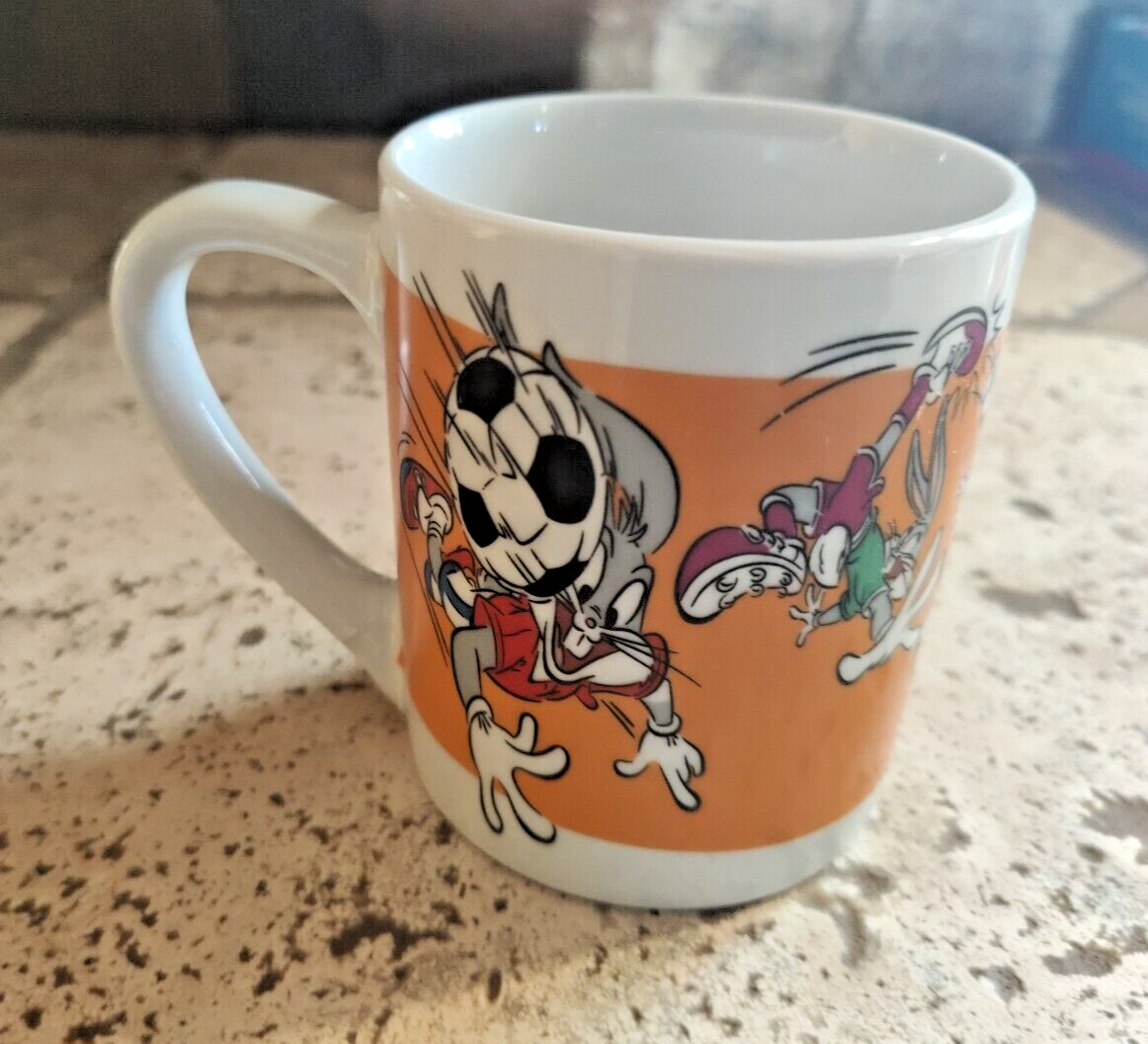 This ceramic coffee mug features Bugs Bunny from the Looney Tunes franchise playing soccer, with a colorful design. Manufactured by Gibson in 2002, it is officially licensed by Warner Bros. The mug is preowned and shows typical signs of wear from age and use, free of any chips or cracks.