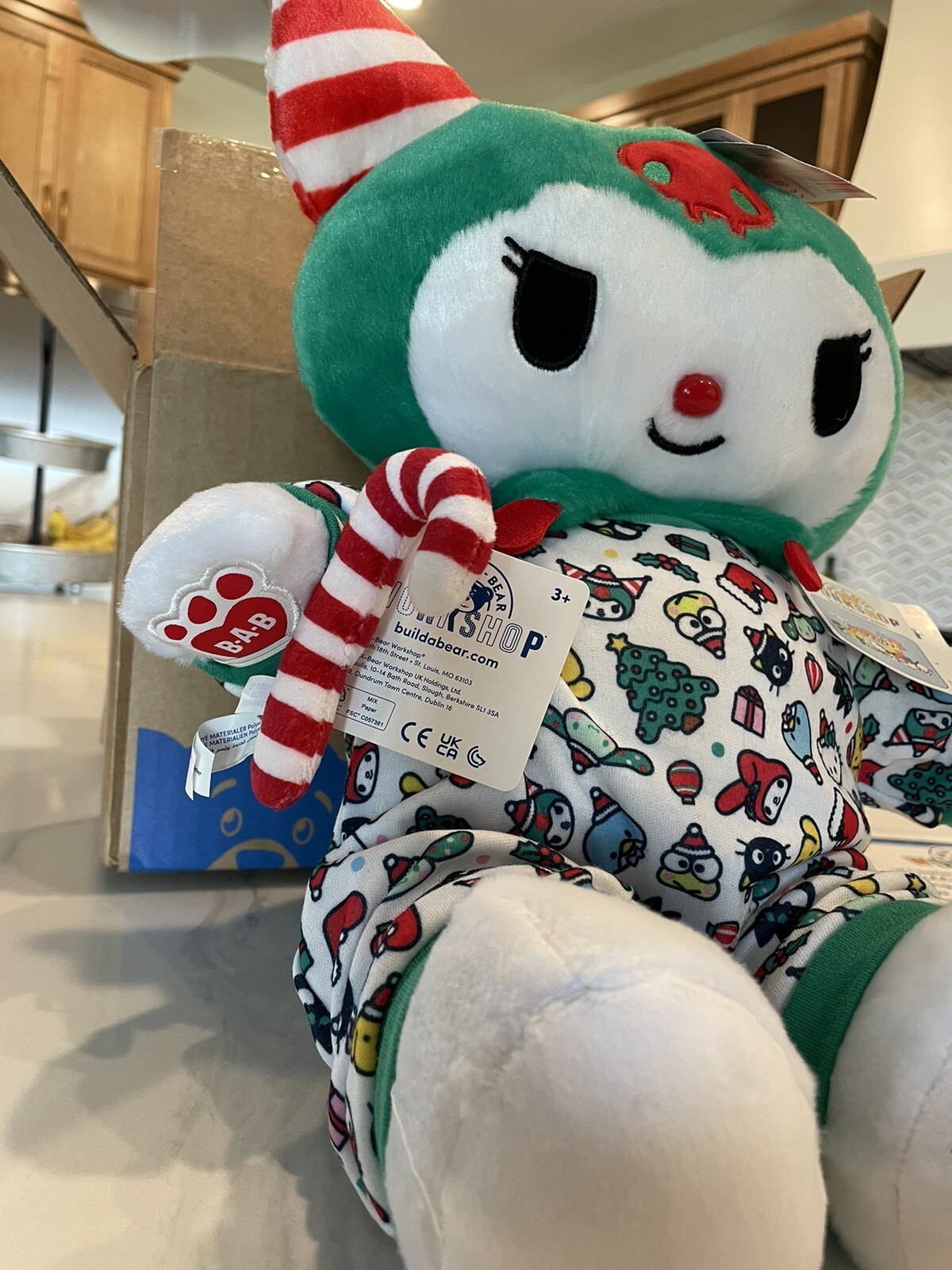 Get ready for the holiday season with this adorable Build-A-Bear Workshop Kuromi plush toy! This cuddly friend is dressed in festive holiday pajamas and holding a delicious candy cane. With her black and white color scheme and Hello Kitty character family, she is the perfect addition to any stuffed animal collection. This brand new plush toy is perfect for Christmas occasions and is sure to bring joy to any child or adult alike. Don't miss out on the chance to add this cute and charming Build-A-Bear Workshop Kuromi to your collection! Brand new with tags!!
