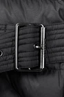 This puffer jacket from Burberry Brit is crafted in a quilted charcoal black synthetic insulated with goose down and feathers, and is trimmed with a tonal leather. It features long sleeves, zip and snap closures on the cuffs, snap-closure shoulder epaulettes, a collared neckline, a belted throat latch secured with snaps, an offset front zip closure with two pulls, a right zip chest pocket, a self belt, front zip pockets, shirring on the underarms and sides; and is lined in a check satin on the body, and a tonal satin on the sleeves. Size: XS Condition: Very good; tearing on armhole lining seams; some marking on neckline, sleeves, and back right hip; light discolouration on hardware. Approximate Measurements (laid flat): Shoulder: 14.5" (37 cm) Chest: 15.75" (40 cm) Waist: 13.5" (34 cm) Length from back: 26" (66 cm) Sleeve length: 23.75" (60 cm) Composition: Main fabric: 100% polyester. Lining: 100% polyester. Sleeve lining: 100% cupro. Filling: 85% grey goose down cluster, 15% grey goose feather.