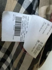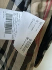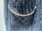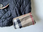 A black, with check trim Burberry ladies jacket. two front pockets and metal Burberry buttons. lining is 100% cotton check and outer material 95% silk and 5% polyurethane. size european 48. very good condition no damage. fits size 16 comfortably