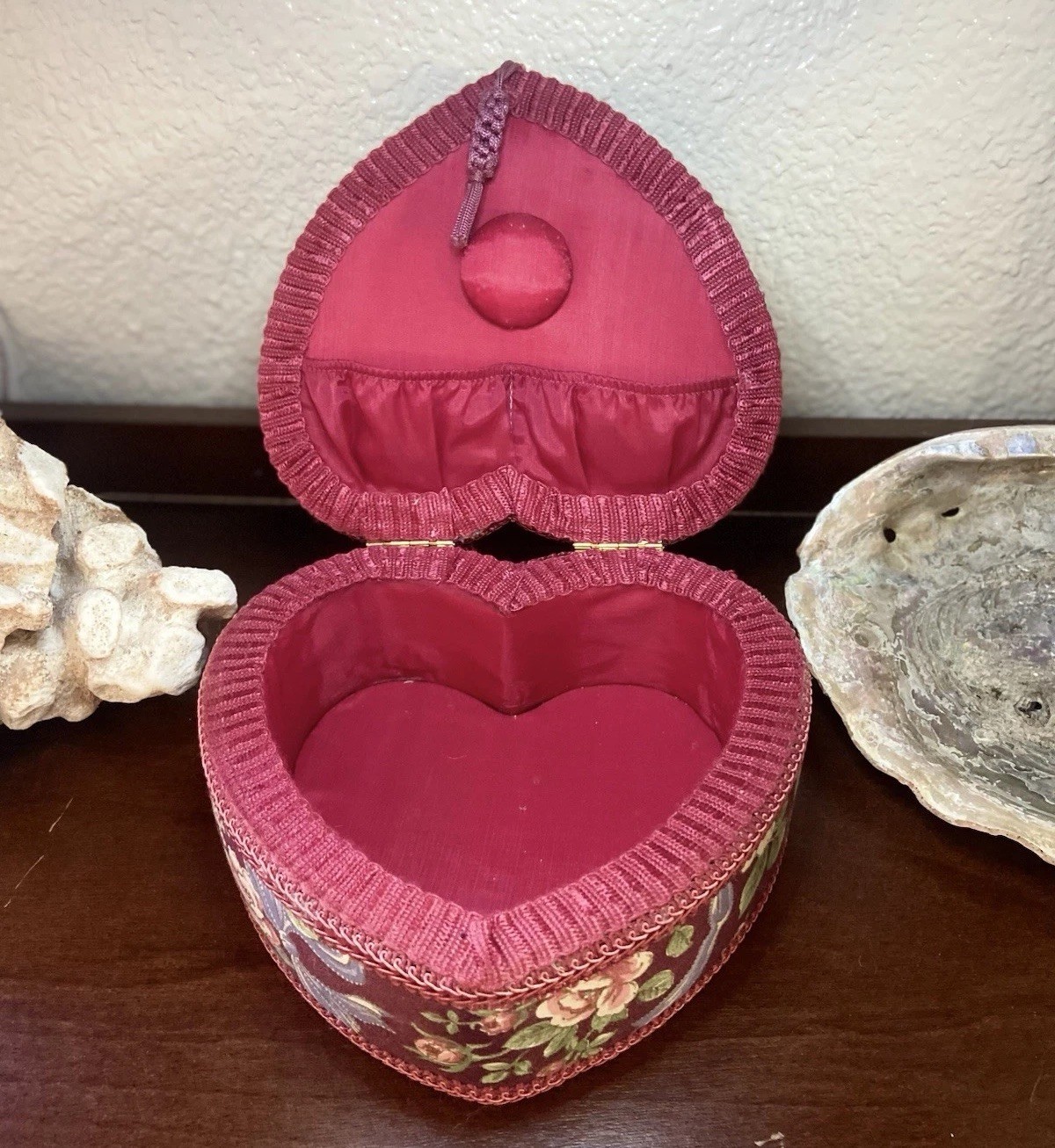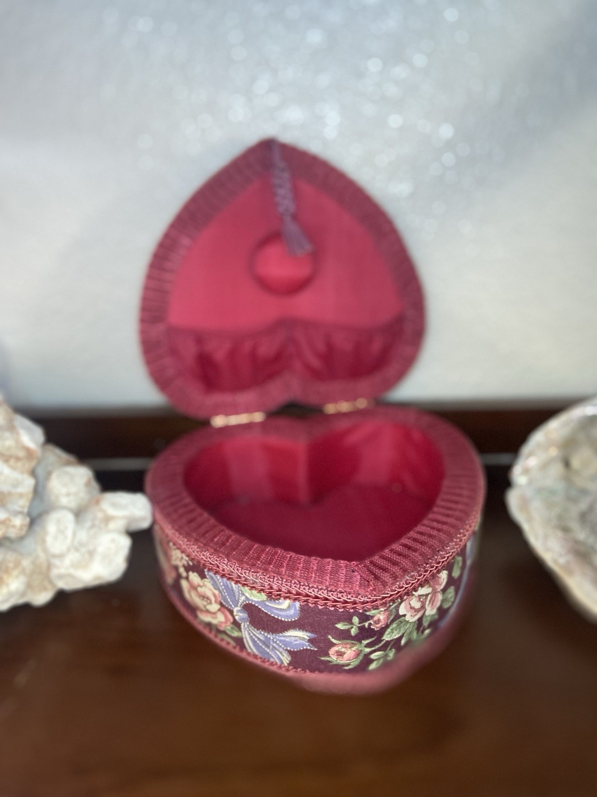 This Burgundy Heart Shaped Jewelry Or Sewing Box is a charming and stylish accessory for any room. The intricate floral detailing on the fabric material adds a touch of romance, making it perfect for all occasions. The heart shape and red color of the box give it a feminine and elegant look, while the ribbon detailing adds a sweet finishing touch. This original piece from the Keepsake Boxes collection is a unique and charming addition to any adult's collection.