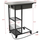 C Shaped End Table with Charging Station Patented Design: Uniquely Designed C Shaped Side Table with Charging Station, a Flip Top Drawer and 2 Tiers Storage Basket Shelf, small side table offers you ample space to storage, meets your charging needs when using electronic devices, within your arm's reach. Upgraded Version - The Charging Station is Designed on Your Left Vertical Side, which is safer to use. You don’t have to worry about electric shock caused by spilled coffee, water, etc. With 2 x USB Ports & 2 x 3-Prong Power Outlets - Low Battery Where is Power Outlet? No need to look around it’s within your arm’s reach. Also, the electrical cord is 6.5 ft long, enough to keep you away from wall corner where the home power outlet located. Thanks to the C-shaped Design, this C shaped sofa table can easily hug the side of your sofa or chair, you can also tuck it under your bed for more convenient use. NOTE: The height from the bottom of the wheel to the top of the base is 2.9”. The Attention to User Safety in Every Design Detail - First, the charging station is designed on the left vertical side instead of tabletop, keeping it away from spilled water. Secondly, the four corners of the tabletop are designed to be round so as not to hurt people. Multi-functional C-Shaped Table - Can be used as a side table, end table, bedside table, sofa table, nightstand, charging table, living room end tables, or bed tables adjustable over the bed. It is not only a C table, but also a side table with storage space, hidden drawer space with 2 shelves, the combination of privacy and open storage makes it more convenient for you to work from home, ideal for small spaces.
