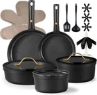 CAROTE 20pcs Pots and Pans Set Non Stick, Nonstick Black Set, Product Details Material: Granite Color: Black Brand: CAROTE Size: 20pcs Black Set Handle Material: Bakelite with Silicone Is Dishwasher Safe: Yes Material Type Free: Cadmium Free, PFOA Free, PFOS Free, Lead Free Compatibility Options: Dishwasher Safe, All Stoves Compatible Number of Pieces: 20 Closure Material: Granite Nonstick Included Components: 10'' saute pan, 4*pan protectors, 2*utensils, 2*handles, 10''/9'' fry pans, 3*trivets, 1*stand, 7*storage lid, 10''/9'' silicone lid, 4qt/2qt sauce pans Is Oven Safe: Yes With Lid: Yes Manufacturer: CAROTE Special Feature: Gas Stovetop Compatible, Electric Stovetop Compatible, Can be used in the fridge, Induction Stovetop Compatible, Can be used in the oven Product Dimensions: 11 x 6.6 x 3 inches Item Weight: 13.2 pounds Country of Origin: China Item model number: cookware set - : Optimal storage and easy stacking with the handles off saves up to 70% more space of Carote detachable handle pots and pans set. - : As both a cookware set and a dinnerware set, 1-time cleaning for all. Cleanup with ZERO elbow grease thanks to the nonstick granite. : Removable handle for the ultimate versatility– go from ALL kinds of hobs to the oven, to the grill, to the fridge, and onto the table in a click. ’ : Balanced convenience-rich features, rapid&even heat transfer, and nonstick performance as the same as other Carote cookware sets.