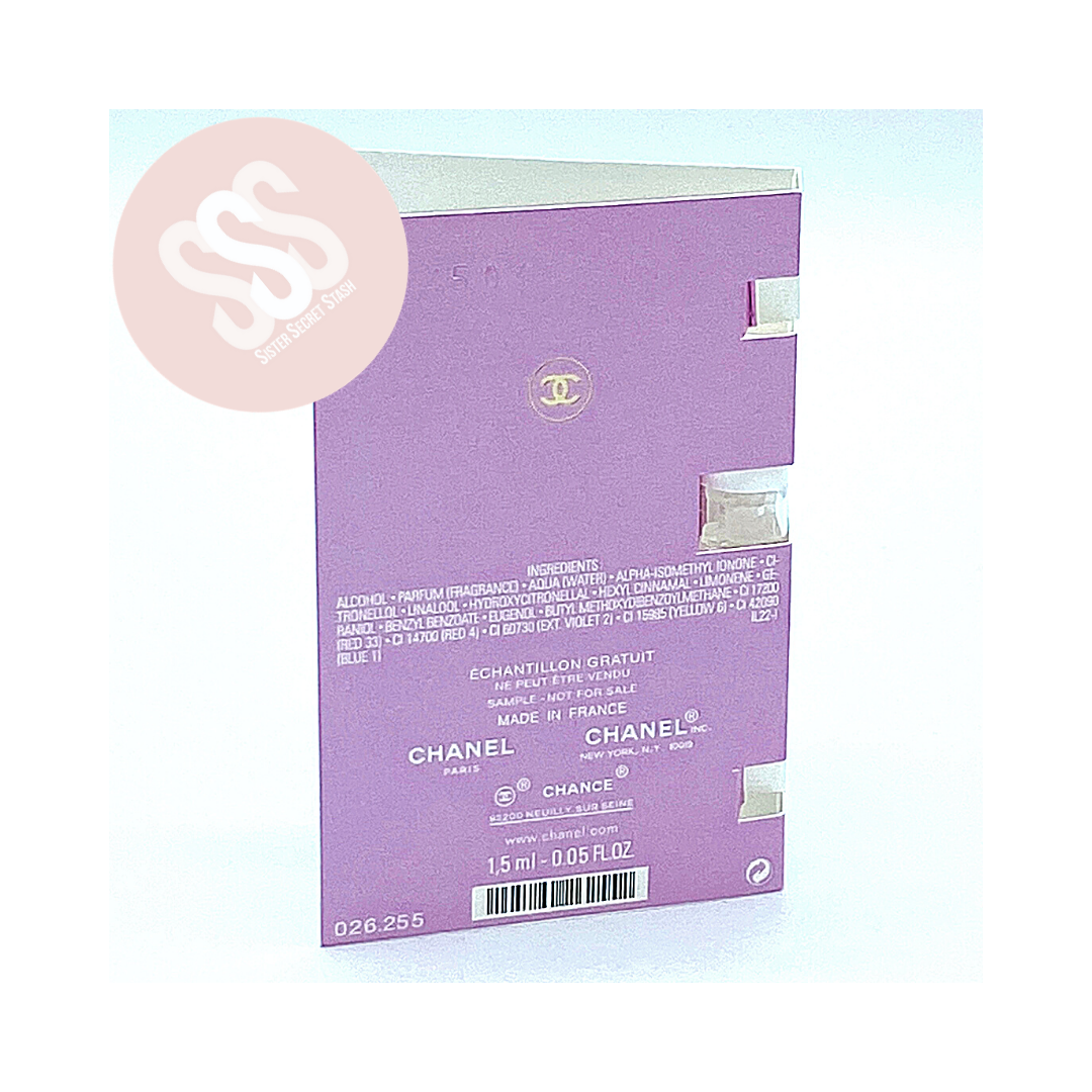 CHANEL Chance Eau Tendre Eau De Parfum .05oz/1.5ml SAMPLE SPRAY. DELICATE AND UNEXPECTED FRUITY-FLORALFRAGRANCE FOR WOMEN CREATES A SOFT WHIRLWIND OF HAPPINESS, FANTASY ANDRADIANCE. TopNotes: GREEN AND FRUITY GRAPEFRUIT-QUINCE MiddleNotes: JASMINE BaseNotes: WHITE MUSKS EAUDE PARFUME COMES IN A SPRAY FOR EASY APPLICATION.