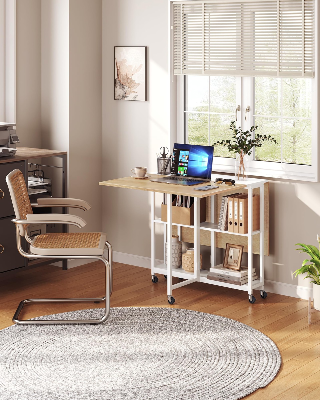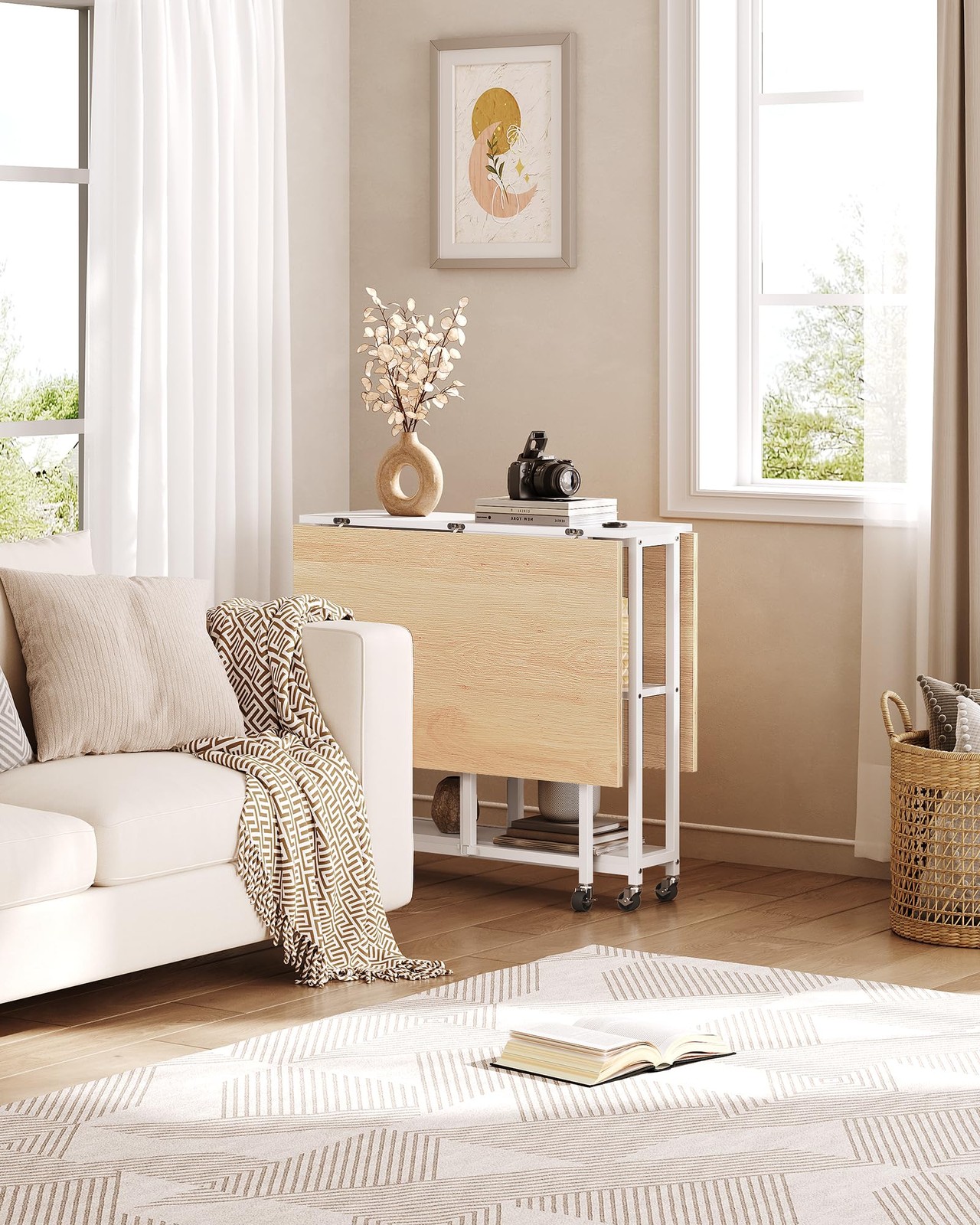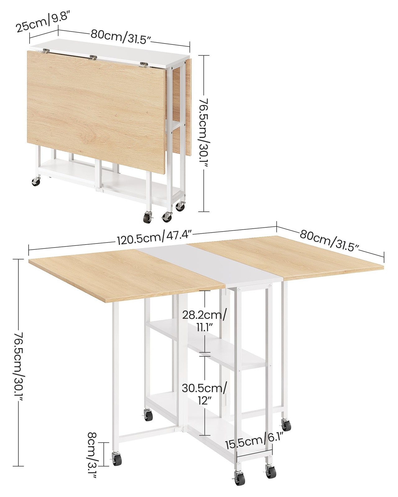 CHOEZON Folding Dining Table, Perfect for Small Spaces The table adopts a folding design to easily free up home space, and 6 wheels with brakes facilitate flexible movement and are highly practical. This folding table is versatile and can be used as a dining table, office desk, sofa table, side table, entry table or craft table. CHOEZON table meets your various needs of home life, making your life more convenient and comfortable! Foldable, Space-Saving: The dining table's size is 47.4"L x 31.5"W x 30.1"H when fully unfolded to seat 2-4 people, featuring a middle support leg with fixed buckles for stability. When fully folded, it measures 9.8"L x 31.5"W x 30.1"H, making it ideal for small spaces Easy Movement and Braking: This dining table is equipped with 6 universal, smooth industrial wheels that provide easy and flexible movement in any direction. The 6 rollers with brakes allow it to be securely locked in place. Go or stop, it's all up to you Versatile Dining Table: This table can be used as a dining table or easily converted into an office desk, sofa table, side table or entry table to meet your various needs like work, study, entertainment, and dining. The 2-layer shelf can store small kitchen items Sturdy and Serviceable: Our dining table is crafted from thick engineered panels and a high-quality metal frame, ensuring durability. The hidden alloy structure and extended hinges under the top are robust and long-lasting, with a great bearing capacity when unfolded Effortless Assembly: All accessories of the dining table are labeled, and the package comes with detailed graphic instructions and required installation tools. You simply follow the steps provided to complete the assembly process in no time