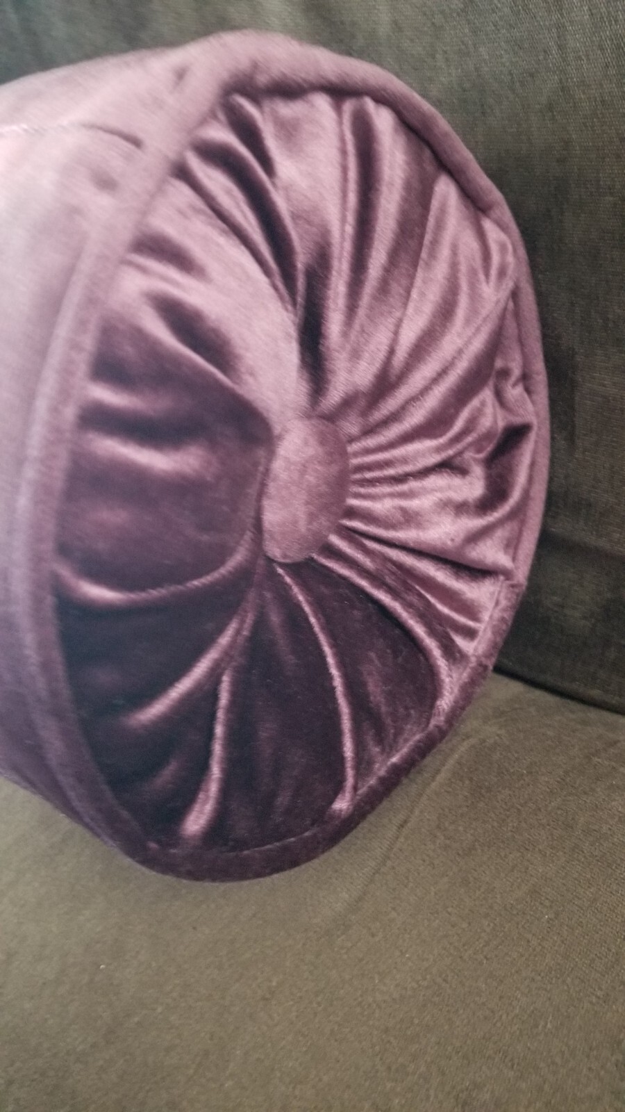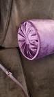 This is a set of two 20-inch long purple velvet bolster pillows, with a decorative button on the side. Excellent condition--no tears or worn spots. 8-in diameter. Traditional style with medium firmness: not too soft or hard. Great for bedroom fashion. Laura Ashley design or style.
