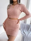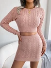 Features: Cable-knit Number of pieces: Two-piece Stretch: Moderate stretch Material composition: 50% viscose, 22% polyamide, 28% polyester Care instructions: Machine wash cold. Tumble dry low. Imported Product measurements: S:Bust 41.34 in, Shoulder 14.57 in, Sleeve Length 21.65 in, Top Length 14.96 in, HIP 39.37 in, Length 15.75 in M:Bust 42.91 in, Shoulder 15.35 in, Sleeve Length 22.05 in, Top Length 15.35 in, HIP 40.94 in, Length 16.14 in L:Bust 45.28 in, Shoulder 16.14 in, Sleeve Length 22.44 in, Top Length 15.75 in, HIP 43.31 in, Length 16.54 in