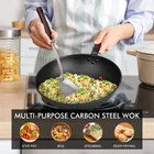[All-In-Wok Set] The carbon steel wok set has a wok pan with lid, wok spatula & brush. Perfect size - 12.9" wide & 3.7 inches deep, can serve at least 3-5 people of food portions, simply the perfect choice for family gatherings. Stir frying wok can meet your various cooking needs, like pan-frying, stir-frying, deep-frying, braising, and steaming etc [Pre-seasoned Wok Pan] Our wok pan is pre-seasoned at 600F Celsius using modern unique nitriding technology, which develops enduring and natural non-stick coating properties. This wok pan is non-rusting, corrosion resistant, easy to clean and can helps you cook original food with less oil [Premium & Enduring Carbon Steel] The wok pan with lid is made of heavy-duty black carbon steel material, upgraded production process, so it superior performance and durability for using. The wok lightweight and responds to heat changes quickly evenly, saves cooking time which makes your cooking more efficient [Thoughtful Detail Design] The flat bottom wok are selected with high-lids that fit perfectly match the pan, detachable solid handle, not hot and easy to ,also easy to use in the oven. Flat bottom design wok pan, suitable for any stoves, such as induction, gas stoves, stoves, and other heat sources. This multifunctional Chinese wok will be the best gift you can give to your family and friends [Excellent Service & ] We are committed to providing the best wok pan for every cooking enthusiast, making every customer satisfied is our ultimate mission. If you have any problems, we are here for you 24 hours a day. Welcoming to the next generation of cookware.