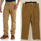 The Carhartt Rugged Flex Rigby Dungaree Work Pants are designed for men in size 34W x 32L. These tan pants feature a relaxed fit with a straight leg style and a mid-rise waist. Made from a blend of cotton and spandex, they offer stretch for comfort and flexibility during workwear activities. The pants have a flat front with a zip closure and button accents, along with cargo and 5-pocket design for storage. Ideal for outdoor and utility work, they are machine washable and part of Carhartt's Rugged Dungaree product line.