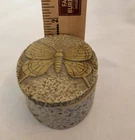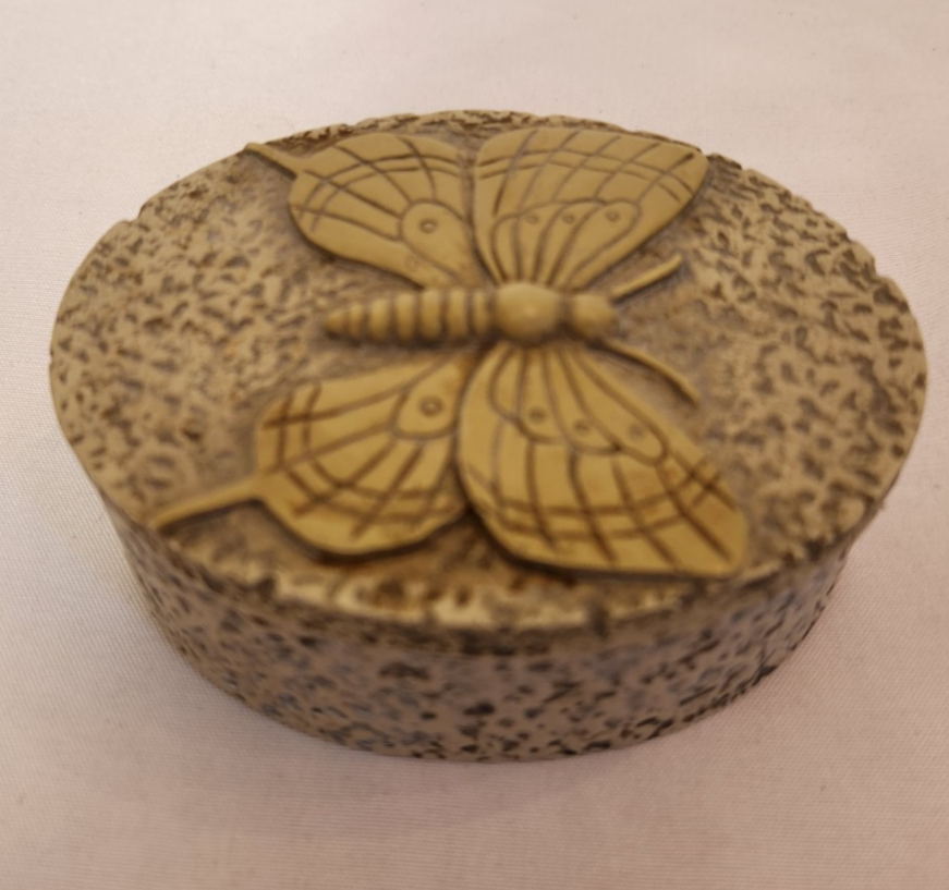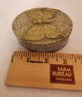 The Carved Soapstone Oval Trinket Box with Butterfly Design Lid is a small and elegant decorative collectible perfect for all occasions. Made of soapstone and featuring a beautiful butterfly design on the lid, this trinket box is a unique and charming addition to any collection of keepsake boxes. The beige color adds a touch of nature and elegance to the piece, making it a lovely and practical item for storing small treasures or keepsakes.