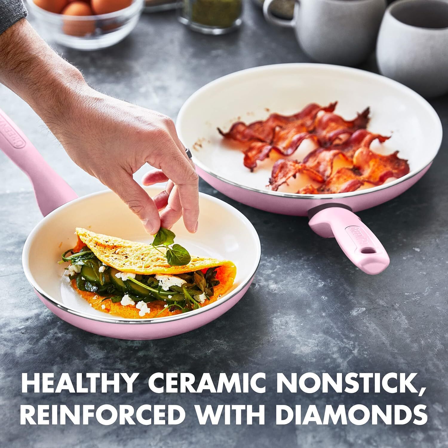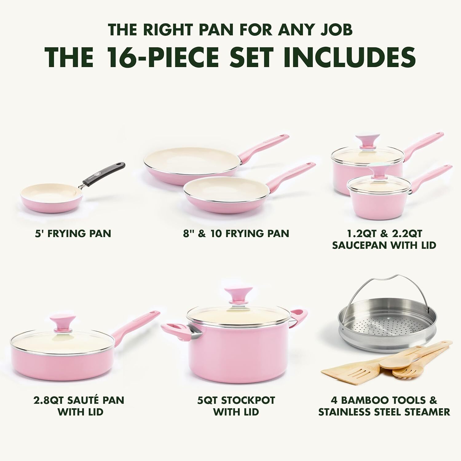 Rio Healthy Ceramic Nonstick 16 Piece Cookware Pots and Pans Set, PFAS-Free, Dishwasher Safe, Pink Item Description Cookware Set Includes: 5”, 8”, and 10” frypans; 1.2QT and 2.2QT saucepans with lids; 2.8QT sauté pan with lid; 5QT casserole with lid; stainless steel steamer; and 4 bamboo tools GreenPan’s Thermolon healthy ceramic nonstick coating is free of PFAS, PFOA, lead, and cadmium, so it will never release toxic fumes, even if it’s accidentally overheated Tough, diamond-reinforced nonstick coating is incredibly durable Heavy-gauge construction provides excellent heat conduction Oven safe up to 350°F Show more Add a touch of color to your kitchen with the vibrant style of the GreenPan Rio collection. This 16-piece cookware set features all the pots and pans you need to make your meals cleaner. Why? Each of these pots and pans features our Thermolon healthy ceramic nonstick coating—an easy release and wipe clean coating that’s free of PFAS, PFOA, lead, and cadmium for worry-free cooking. Unlike many other nonstick coatings, it will never release toxic fumes, even if it’s overheated. This durable coating is reinforced with diamonds to provide peak nonstick performance longer. The set’s heavy-duty construction gives you even heat distribution while the stay-cool Bakelite handles give you a comfortable grip and total control. Durable glass lids give you an easy view of your meal in progress without sacrificing heat. Dishwasher safe. These pans and lids are oven safe to 350°F. This cookware set includes: 5”, 8”, and 10” frypans; 1.2QT and 2.2QT saucepans with lids; 2.8QT sauté pan with lid; 5QT casserole with lid; stainless steel steamer; and 4 bamboo tools.