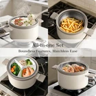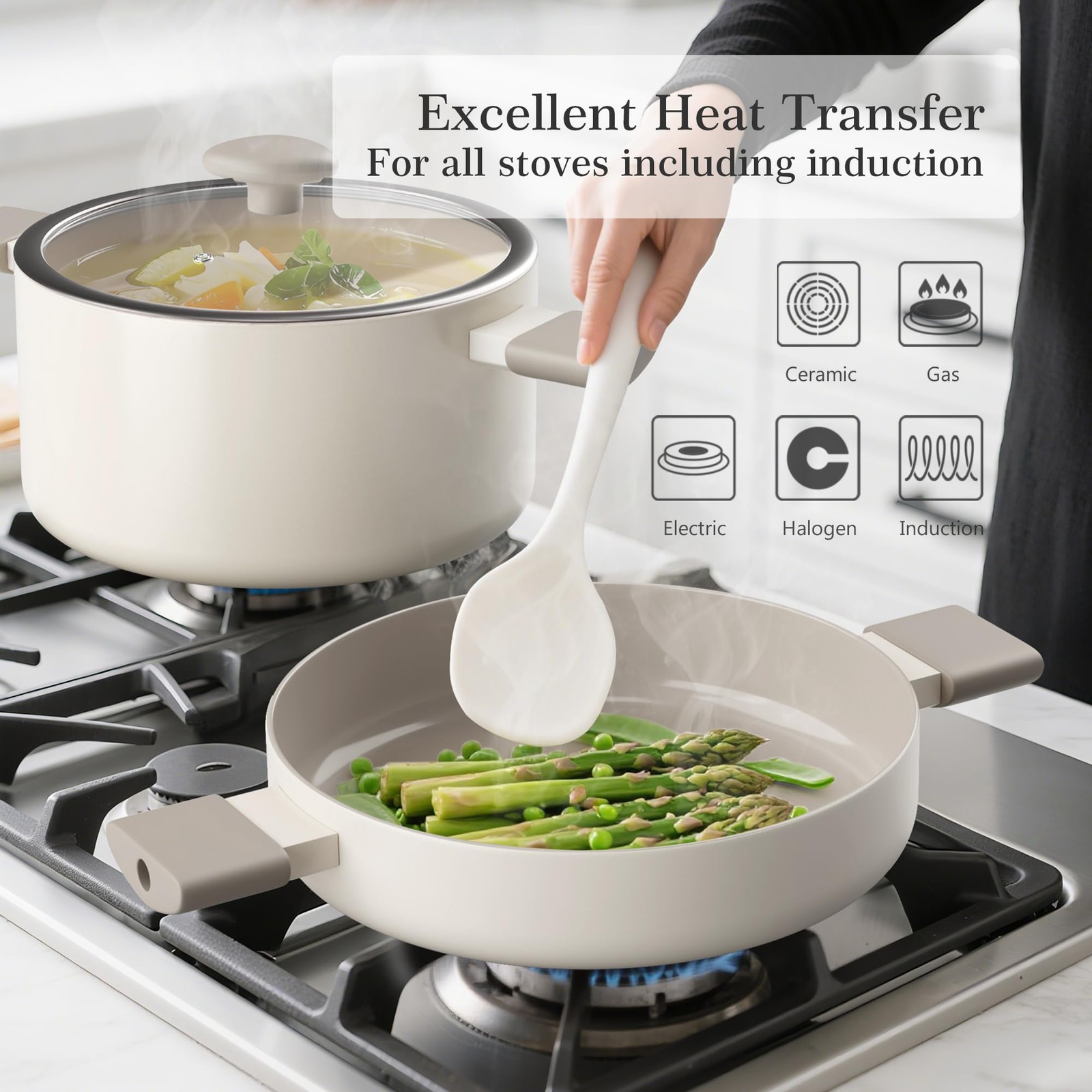 < p>Ceramic pots and pans set non stick cookware set kitchen cookware set white and gold non stick cookware set non toxic cookware set < p > 1; Our non stick pans and pots set is made of nonstick Ceramic coating that is free of harmful chemicals such as PFOS, PFOA, lead and cadmium, making cooking healthy and worry-free< /p> < p > 2; Made of high-quality aluminum alloy material combined with a magnetized base. The flat base design of kitchen set allows kitchen cookware sets to be placed evenly on the heat source. High magnetic conductive stainless steel base of cookware sets on sale allows thepan set nonstick to work on all cooktops except Induction< /p> < p >3; This nonstick cooking pot set is made for any kitchen and cooktop. It can be used effectively on gas, and electric stove tops.< /p> < p >4; These durable nonstick pans ollas de cocina make cooking easier than ever, cleaning enjoyable< /p> < p >5; The multi-layer nonstick coating of cooking pan set on these natural elements cookware clearance is made without PFOA and allows food to get "tan"and slide right out of the pan without adding extra oils< /p> < p >6; The premium construction of set de ollas de cocina provides even heat distribution for cooking results that are so beyond< /p> < p >7; The multi-layer nonstick coating of large skillet set sartenes de ceramica allows for easy food release and clean up< /p> < p >We are specialized in manufacturing skillet pan with lid, kitchen cookware sets, pots and pans set nonstick, nonstick cookware sets, kitchenware set, nonstick skillet pan, our place always pan. We believe that quality is the life of a brand. We believe that quality is the life of the brand, we have been using high quality, high standards of strict selection of materials, which you will find really different from the others.< /p> KITCHEN COOKWARE SET: Includes a 5-quart stockpot, 9.5" sauté pan, pasta strainer insert, steamer basket, rice steamer, 3pcs ceramic bone China and a Tempered Glass Lid for your cooking needs NON-TOXIC CERAMIC COATING: This pots and pans set's healthy nonstick coating is free of PFAS, PFOA, lead, and cadmium, making it safe for you, your family, and the environment UNIQUE DESIGN: The sauté pan can transform into a stock pot lid, effectively sealing the soup pot, locking in heat and steam, accelerating the cooking of ingredients, and saving energy and time COOKING BASKET: The stainless steel pasta strainer insert makes it easy to cook grains, beans, and veggies to perfection. Enjoy easy and clean draining, while preserving cooking water for broths, stocks, and sauces VERSATILE STEAMER: The included steamer expands the functionality of the soup pot, enabling you to conveniently steam fresh corn, broccoli and asparagus, and other varieties of vegetables, and expand your cooking options FOR ALL COOKTOPS: The innovative induction base of the nonstick cookware set delivers uniform heat distribution on all cooktops, such as induction, gas, electric, halogen, or ceramic CONVENIENT STORAGE: All products are compactly designed and can be stacked for storage, saving kitchen space and making it easy to organize and store