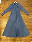 This Chadwicks of Boston blue denim dress is a timeless piece that will fit seamlessly into your wardrobe. The dress features a collared neckline, long sleeves, and a button front closure, making it suitable for a variety of occasions including travel, casual outings, and workwear. The dress is made of high-quality cotton material and has a solid pattern, making it a versatile addition to your wardrobe. The dress is a size 8 and has a long 54” length, perfect for any season including summer, fall, and spring. The dress has a Western, peasant, or 90s theme, adding a touch of uniqueness to your outfit. The skirt is cut on the bias. This shirt dress is a must-have for any fashion-forward woman and is sure to make a statement wherever you go.