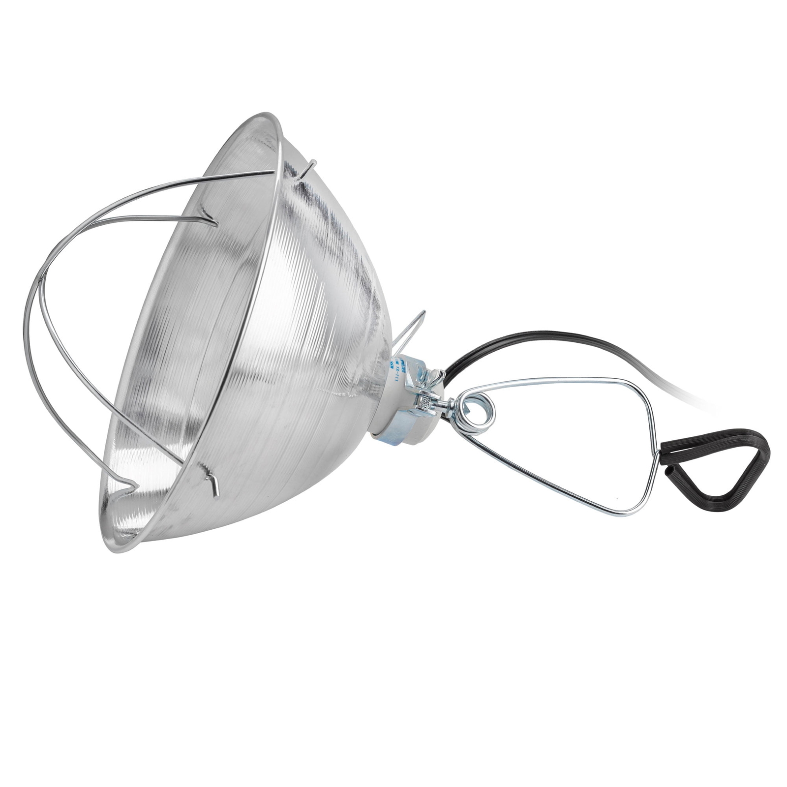 The Champion Electronics Aluminum Clamp Light is designed for halogen, incandescent, and LED bulbs up to 300 watts maximum and includes a protective front guard, making it perfect for use as a heat lamp, brooding fixture, or anywhere higher wattage bulbs are needed. No bulb is included, allowing you to choose the best light for your application. The clamp light has a 10" silver aluminum reflector and is a perfect tool for your garage, barn, workshop, attic, or anywhere portable light is needed. The adjustable base of the steel spring clamp allows the light to rotate 360 degrees making it easy to put the light where you need it most. In addition, the porcelain socket accepts standard medium base bulbs(e12) and includes a 6 foot power cord. A vinyl sleeve covers the clamp surface to secure the light and provide scratch resistance to most surfaces. Do not use in the presence of flammable or combustible material or Hazardous Locations. For Dry Indoor Use Only. 10” Champion Electronics Aluminum Reflector for Use with LED, Halogen, or Incandescent bulbs Porcelain Medium Base Socket for High Wattage and Heat Applications Spring Steel Adjustable Clamp Allows 360 Rotation Vinyl Coated Clamp Surface Designed for Scratch Resistance Base Type: Standard - Medium (E26) 300-Watt Maximum Bulb Rating (not included) Material: Aluminum shield, Steel Clamp Dimensions:10"" x 10" x 12" Cord Length: 6FT Color: Silver Quantity: 1