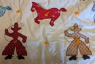 Adorable quilt with cowboy and horse appliques and yarn ties. The fabric is cotton; the batting is either all cotton or a cotton blend. The fabric on the back looks like western belt buckles. Super cute! Measures 34" x 58". Clean and in excellent condition with no odors or stains. Great for crib, wall decor or lap blanket! Thank you for looking!