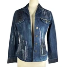 FOX 8 News Anchor Stefani Schaefer is modeling the jacket in the cover shot & gives us a sneak peek of this year’s Designer Dress Days READ Pre Owned Gently Worn ONLY ONCE Excellent Condition Gorgeous Appliqués Patches with Different Shades of Denim Fringed, Frayed, & Purple Accents Measurements Are Approximate to 1/2” Chest 33.5”-34.5” Waist 28”-29” Length 24” Sleeve Length 24” Fabric Content Cotton 100% Note: the top button is missing I didn’t notice when I purchased the piece at Chico’s and it was Clearance & couldn’t be returned. It’s unnoticeable Price reduction by 25% for the minor flaw Clean Home Non Smoking No Indoor Pets Loft240124