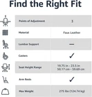 Office desk chair for home office, work station, or conference room Adjustable seat height, adjustable seat angle, and tilt control for customizable comfort Supports up to 275 pounds; sturdy KD metal base; comply with BIFMA standard, a nonprofit organization that creates voluntary standards to support safe standards for business and institutional working environments Puresoft PU upholstery in Black; contoured padded seat, backrest, and armrests for comfort; durable caster wheels for smooth-rolling mobility Assembly instructions included; components (casters, base, arms, seat mechanism, hardware kit) arrive packed in the back cushion Product Dimensions: 23.75 x 26 x 38.25 - 42 inches (WxDxH); seat width: 19.5 inches; seat depth: 17.75 inches; arm height: 26.25 - 30 inches Product Description Amazon Basics Classic Puresoft PU-Padded Mid-Back Office Computer Desk Chair with Armrest - Black From the Manufacturer Amazon Basics