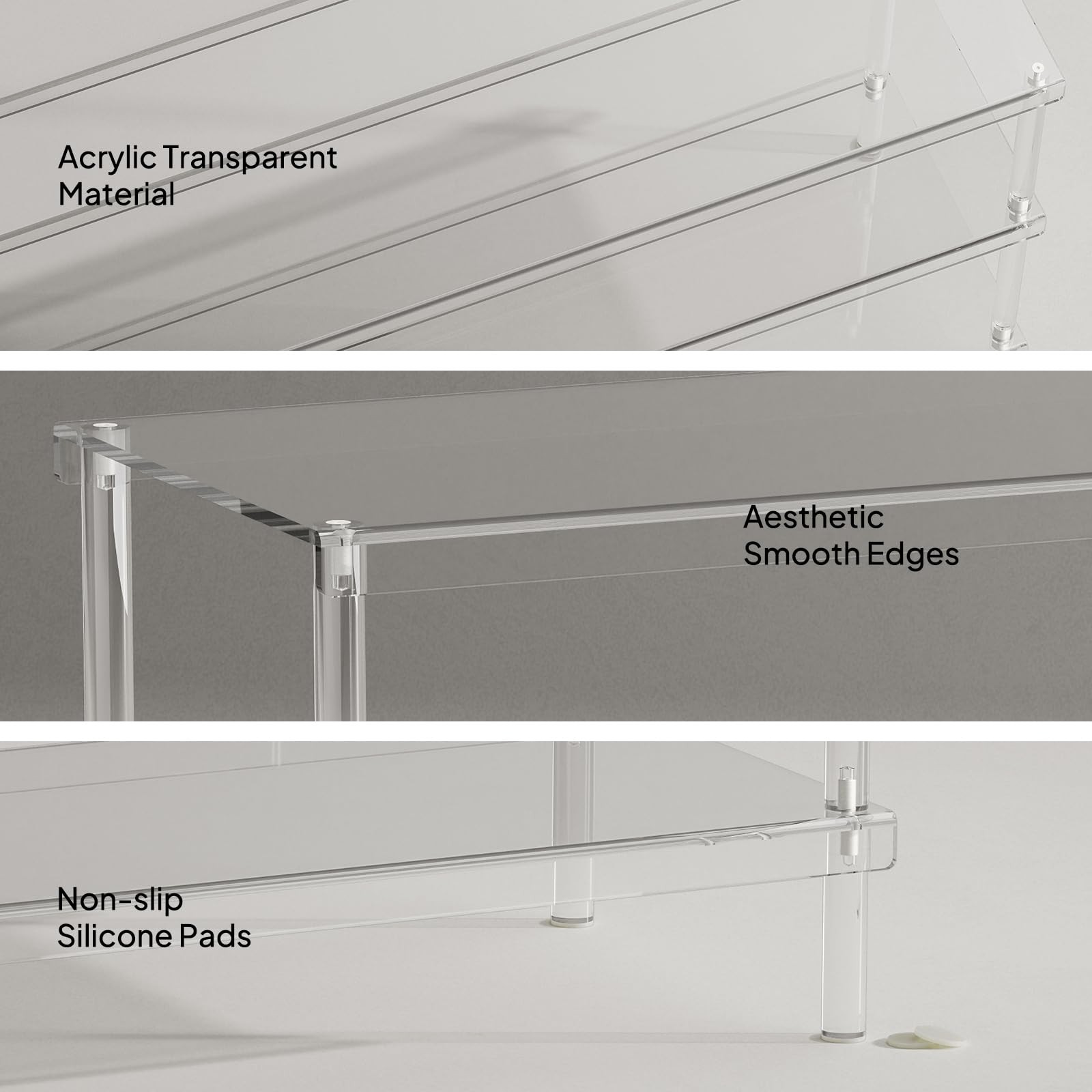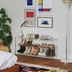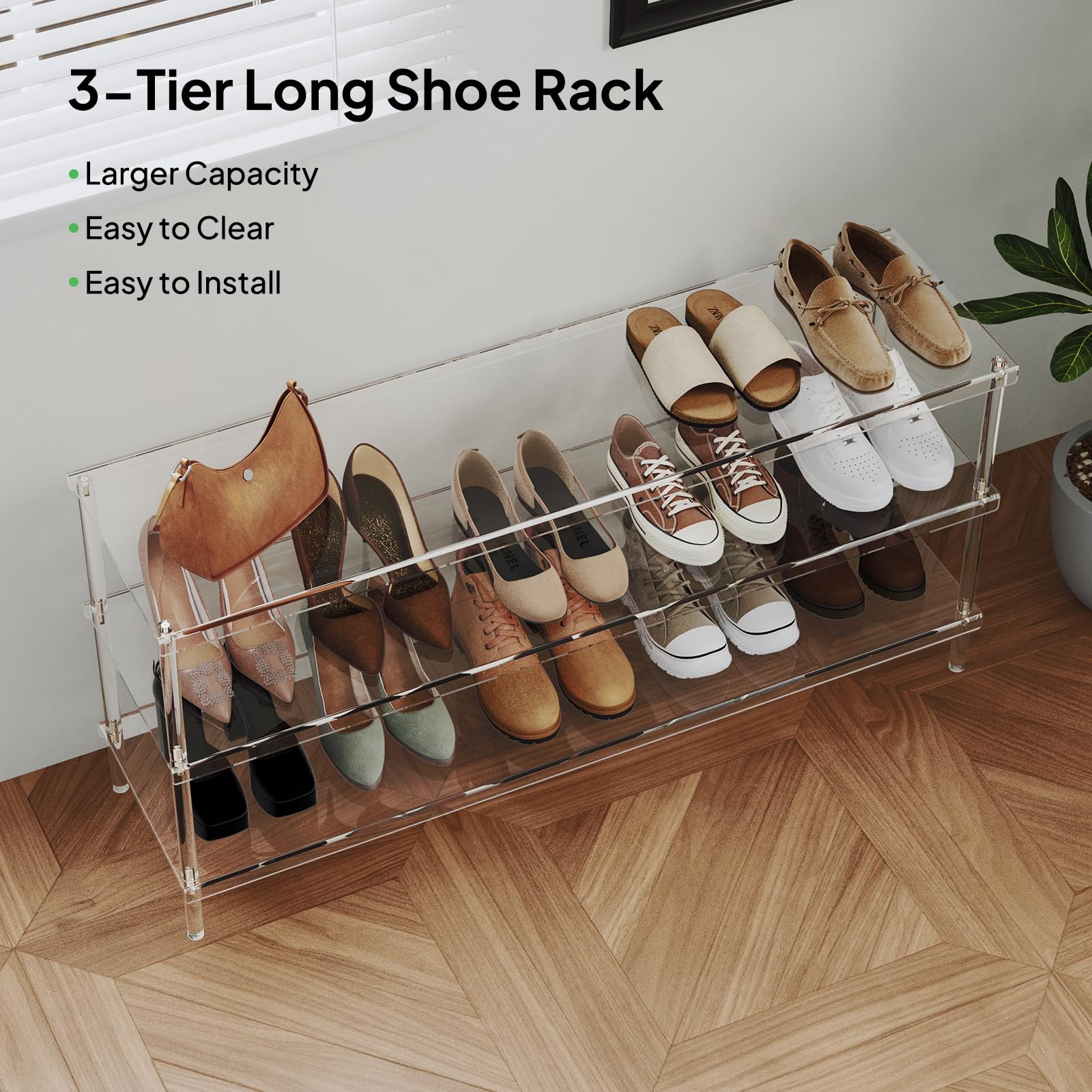 3-Tier Acrylic Tall Shoe Rack can holds 5 pairs of shoes each layer High-Quality Material - Made of superior clear acrylic, durable, moisture-proof, making cleaning and maintenance easier. Dust glides off its silky surface, fearless of the outdoor environment. Stays pristine for decades. Wide Shoe Rack - This 3-tier long shoe rack is 42.7'' L x 11.8'' W x 20.5'' H. Each shelf can store up to 5 pairs of shoes, and the three storage tiers can hold 15-20 pairs, covering the whole family's various shoe storage needs. It's a perfect solution for shoe-changing and storage. Modern Minimal Style - The clear shoe storage shelf is elegant, low-key, and simple. It is not obtrusive in any place, easily integrated into any home decor, and greets guests with minimalist sophistication. Multifunctional Shoe Organizer - With a width of only 11.8 inches can still store various types of shoes such as slippers and sports shoes even in a narrow entrance. It is also perfect for doorways, walk-in closets, living rooms, bedrooms, and a cloakroom. Make the most of tight storage areas. Easy to Assemble - The manual details all assembly components and marks and disassembles them in detail, ensuring that anyone can install them quickly and easily. It only takes a few minutes to have a beautiful shoe rack.