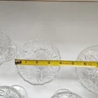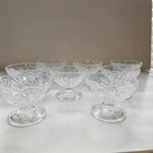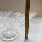 This vintage eight-piece set of ice cream dessert bowls features a classic pressed glass design in clear color. Each bowl measures 3 inches in height and 4 inches in diameter, making them perfect for serving ice cream or other desserts. The unbranded bowls have a timeless appeal and are suitable for all occasions, adding a touch of elegance to your table setting.