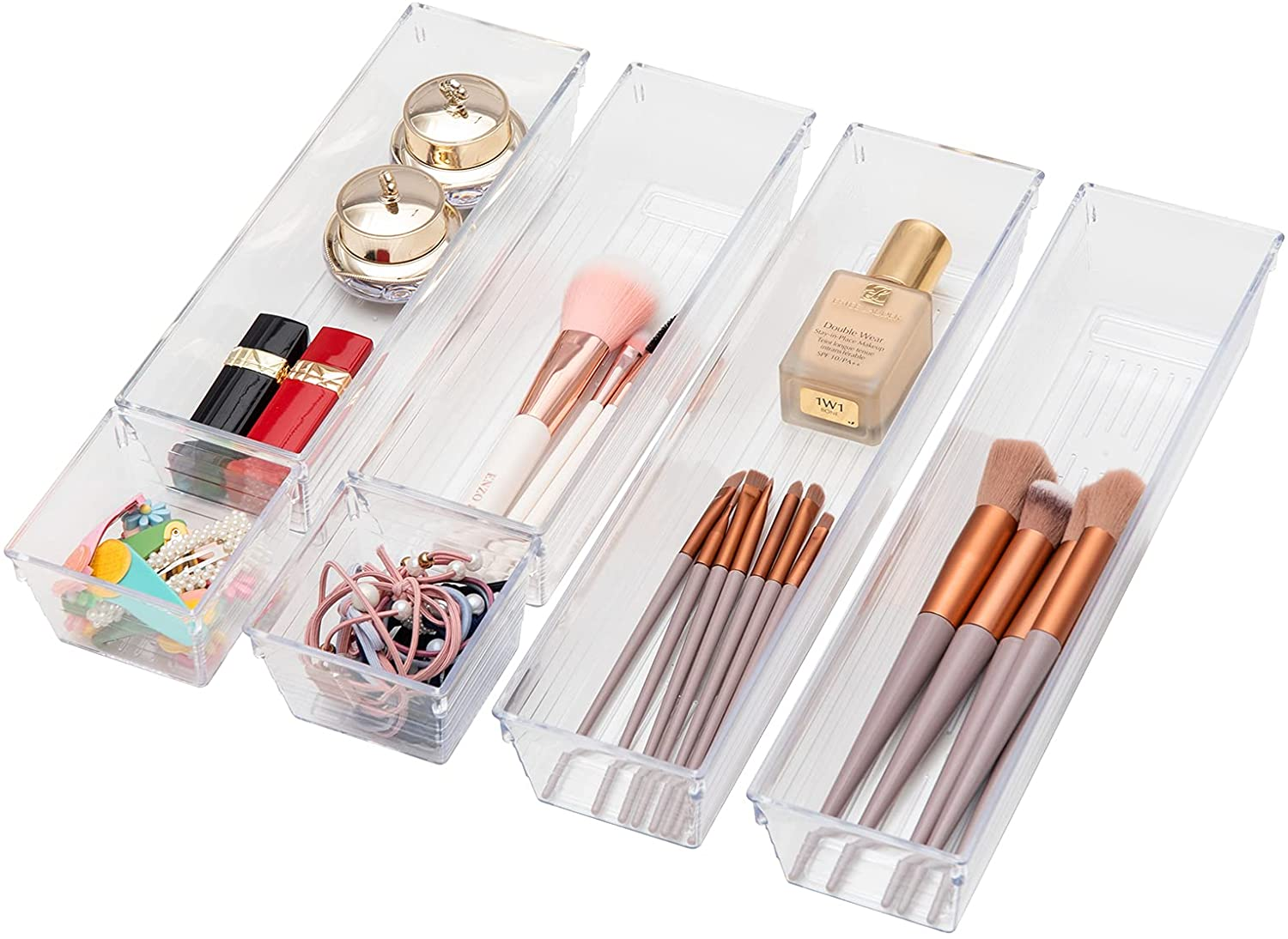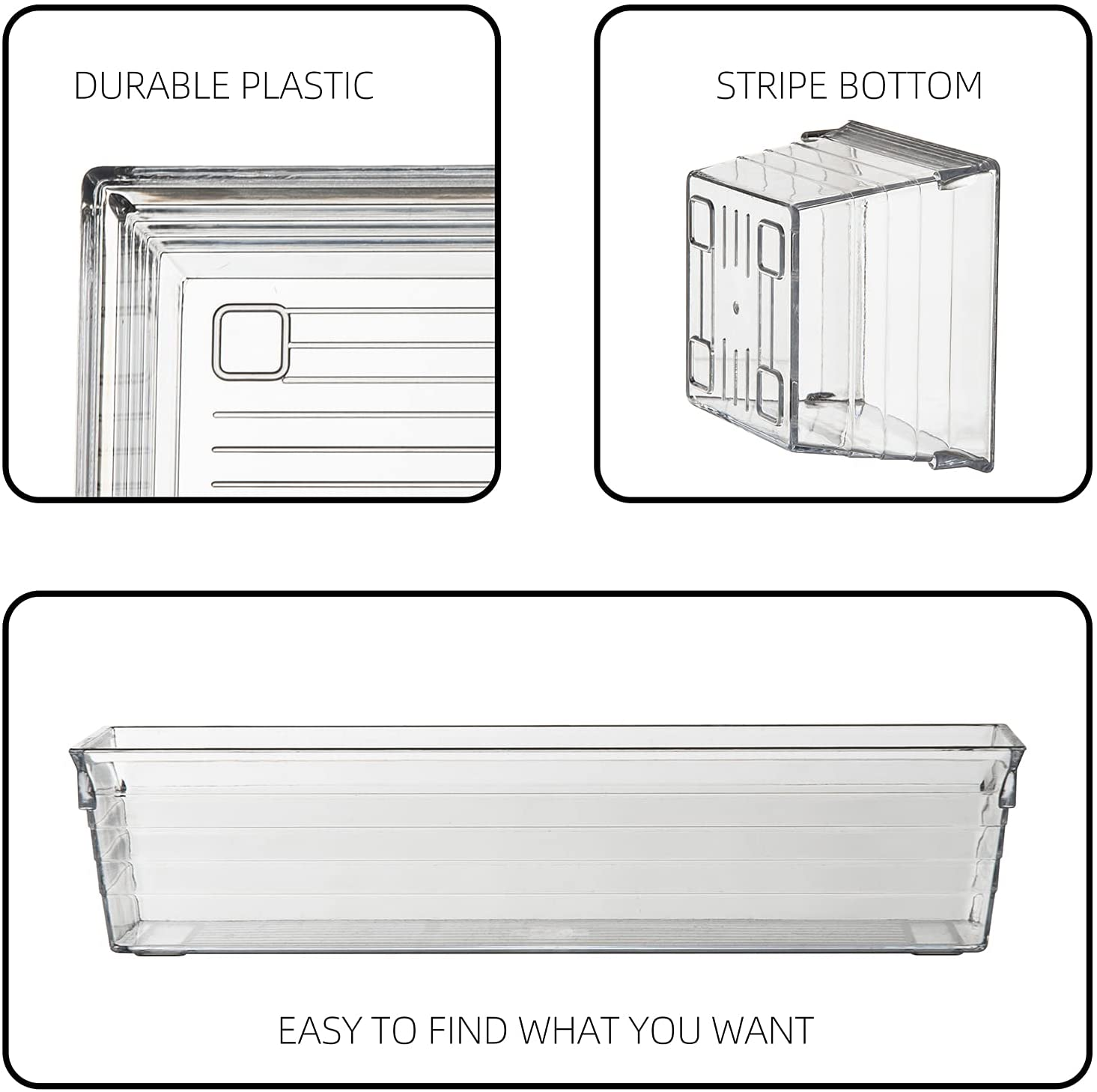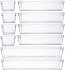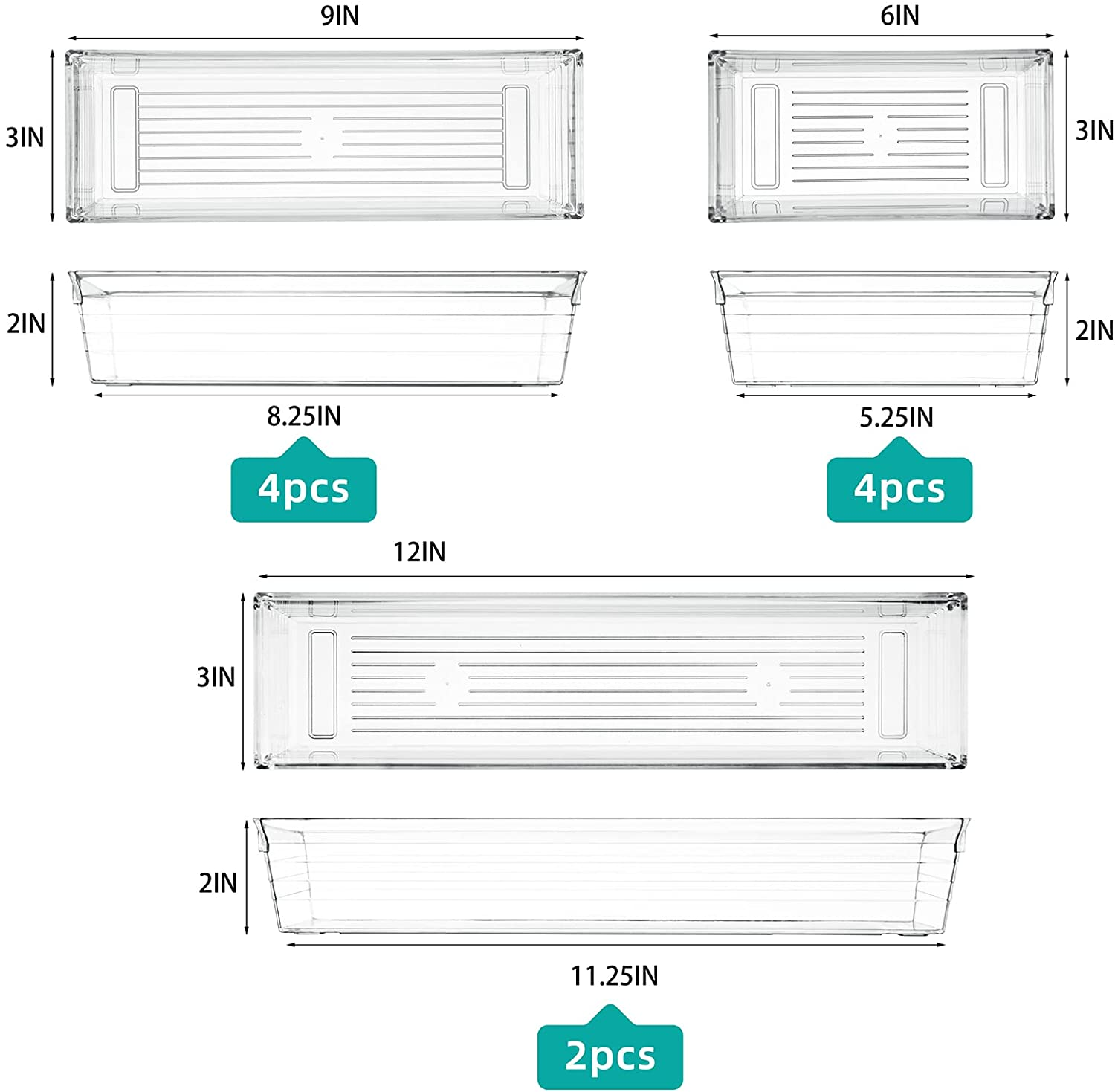 Includes:(2) 12 L x 3 W x 2 H in, (4) 9 L x 3 W x 2 H in, and (4) 3 L X 3 W X 2 H Material: Acrylic(Plastic) Features: Clear ,Easy to Clean,Eco-friendly,Transparent,BPA Free,Unbreakable,Recycled. Mix and match for any drawer size and storage need. Packing: bubble pack + plastic wrap +Outer Catrton Product Description 10 Piece drawer organizers √ Durable plastic √ Easy to find what you want √ Separate design for multiple combinations MAKE EVERY THING ORGANIZED Backerysupply store Clear ,Black,White,Colors Plastic Desk & Drawer Organizers,Have Different size ,You can arrange them anyway as you want.They keeps everything neat and organized! Set Of 10 Clear Plastic Desk & Drawer Organizers Used for cosmetics, kitchen,bathroom,office drawers.Perfect to organize cosmetics, makeup tools, hair accessories, nail polish, jewelry, toothpaste, hairbrushes, medicine, silverware, office supplies. Drawer organizer can keep everything organized, neat and tidy. And maximize the use of storage space. Made of durable plastic, clear design makes it easy to see the item and quickly find the items you need. Package Included: 2 x Drawer Organizer(12" x 3" x 2") 4 x Drawer Organizer(9" x 3" x 2") 4 x Drawer Organizer(3" x 3" x 2") For makeup organized perfect to storage your face brush, skincare, toner, hair accessories ,and so on, etc. For office supplies organized perfect to storage your pen, ballpoint, highlighter, marker, pencil lead, eraser etc. For home item organized perfect to storage your watches,glasses,key chain etc.