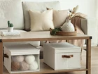 Natural Fiber The see-through window of the fabric shelf bins is made of highly breathable PVC mesh fabric with no chemical smell. The clear window enables you to instantly locate your items without rummaging around. With its edged lid, this closet organizer provides dust protection for your items and allows for stackability to maximize your vertical storage space. The 2 sewn-in PU handles have a smooth, comfortable touch. It is easy to grab, making the storage bins easy to carry. Storage bins for shelves, closets, wardrobes, cube cabinets, end table, bedrooms, kids' rooms, playrooms, nurseries, living room, etc. Product Description About StorageWorks Closet Storage Bins This closet storage organizer is a functional solution to clutter and disorder. It features fabric baskets in neutral colors that can match many home styles, and a large clear window that allows you to easily locate your items. The functional storage bins are perfect for organizing your bedroom, nursery room, living room, RV, camper, dormitory, and more. See-Through Window You can easily locate your stuff through the clear window without rummaging around. Lids with Protective Edge The storage baskets each come with a lid with an edge that fully covers the sides of the bin, providing dust-resistant storage while enabling stackability. Sturdy and Durable These durable closet storage bins are made of high-quality fabric and have heavy-duty bottom board inserts, enabling them to hold a weight of up to 25 lbs. On the Cabinet As an effective solution to clutters and disorders, the functional storage bin is perfect for organizing your home. On the Shelves Suitable for organizing your items on the shelves, in the linen closet, wardrobe, pantry, bathroom, bedroom, living room, entryway, etc. Under the Table Well-contructed storage basket suitable for collecting kids' toys, art supplies, clothes, blankets, and other items.