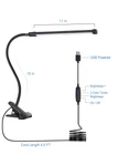 Description Feature 1)3 color modes in 1 lamp.Working,study or reading,relaxing 2)10 dimmable levels to turn up and down(10%-100%) 3)LED eye protection,energy saving,no flicker,no dazzling 4)Aluminum alloy high end manufacturing,good heat dissipation 5)Flexible mental gooseneck and sturdy clip-on at your DIY modeling, perfect space saver 6)USB cable to computer,tablet PC,power bank 7)Life time lasts for 50000 hours 8)Memory function 9)8W clip reading lamp is equal to 40W tranditional lamp 10)As a bed reading light, you could adjust the flexible neck and position it properly,never disturb your family menber nearby 11)Perfect for working as office lamps, reading lamps and study lamp for children, task lamp for architects and artist and bedside table lamps,workbench lights,writing lights,clamping lamp,architecture lighting 12)18 months warranty,24hrs service,30-DAY money back guarantee Specification Product Name:Clip On Desk Lamp Rated Power:8W Input Voltage:5VDC /2 A LED Color:Warm white,pure white,cool white Color Temp:2700-3200K,4000-5000K,6000-6500K Mode:Relaxing,reading or study,working Light Flux:640lm,760lm,800lm Beam Angle:180 degree LED Bar Dimension:L11xW0.8XH0.9 inch Flexible Arm Dimension: Diameter 0.4x15 inch for all space Clamp Dimension:L4.5xW.32xH2.5inch Clip-on Height:2.4 inch Cable Length:4.5 FT Net Weight:0.5 bl Certification:CE RoHS Application:Bedroom,study room,studio,office,dormitory,kitchen etc What is in the box 1x modern clip on led desk lamp 1x user manual Back to School Supplies, Paint and Work in Natural Daylight: Easel light offers a natural and soft light close to the sunlight(CRI>90), ensuring your artwork pops with precision and vibrancy. Task lamp is eye caring, free from flicker and glare. Flexible Neck and Sturdy Clip: The 15-inch flexible yet strong gooseneck can be twisted into various shapes and stays in place, allowing precise light placement for your art projects. The clip, lined with sponge, opens up to 2.4 inches, securely holding onto surfaces without damaging furniture. With a 6 FT long USB power cord, you won't need an extension cord even if there isn't an outlet nearby. 3 Color Modes and 10 Brightness Levels: The clip on desk lamp offers warm light(2700K), warm white light(4500K), and cool light(6000K), suitable for reading, studying, relaxing, working, thinking, relaxing, drawing, knitting, sewing, puzzles etc. Adjust the lighting with the 10-step dimmer to ensure the perfect illumination for any creative task. Durable Aluminum Construction and Extended Lifespan: The bedside reading lamp is crafted from high-quality aluminum, ensuring superior heat dissipation and preventing it from getting hot during use. This results in an extended lifespan of up to 50,000 hrs. Lightweght and Memory Function: This dimmable LED desk lamp is versatile and easily used on easels, bookshelves, dorm rooms, music stands, pianos, office tables, computer desks, bed headboards, drawing boards, makeup tables, desktops, and for various crafts. When turned on, the table lamp for desk automatically recalls your last setting.