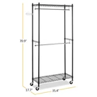 Details Introductions: If you are always bothered by your messy room; this Garment Rack Clothes Hanger is highly recommended to you. Adopting high quality material; it features stable; sturdy and durable. It can create extra storage space instantly; and instantly organize your messy items into neat condition with little effort. With smooth rolling and stable stand; it's easy to move around your house and secure lock in space with 4 industrial wheels(Two locking). Moreover; it has a swinging arm and adjustable shelves; which allows you to organize belts; ties; shoes; purses and other stuffs. Don't hesitate; just take it home! Features: 1. Made of high quality material; stable; sturdy and durable 2. It has a long service time 3. Large storage capacity; make your room no longer in a mess 4. Flexible wheels; easy to move to anywhere 5. Spacious and adjustable; multifunctional and practical 6. Easy to assemble and maintain Note: 1.When receiving the goods; please confirm the product according to the listing of instructions. Once you find Less pieces; please provide relevant pictures to contact us. We will deal it in the time. 2.Please install goods with the instruction manual. 3.It is recommended that the installation should not be too tight to adjust easily. After the structure is installed; firm the interface for more stability. Specifications: 1. Material: Carbon Steel 2. Color: Black 3. Surface Finish: Powder Coating 4. Dimensions: (35.4 x 17.7 x 70.9)" / (90 x 45 x 180)cm (L x W x H) 5. Pipe Size: 19x1.0mm (Diameter x Thickness) 6. Weight: 16.3 Lbs / 7.4 kg 7. Per Shelf Maximum Load: 66 Lbs / 30 kg Package Includes: 1 x Garment Rack Hanger