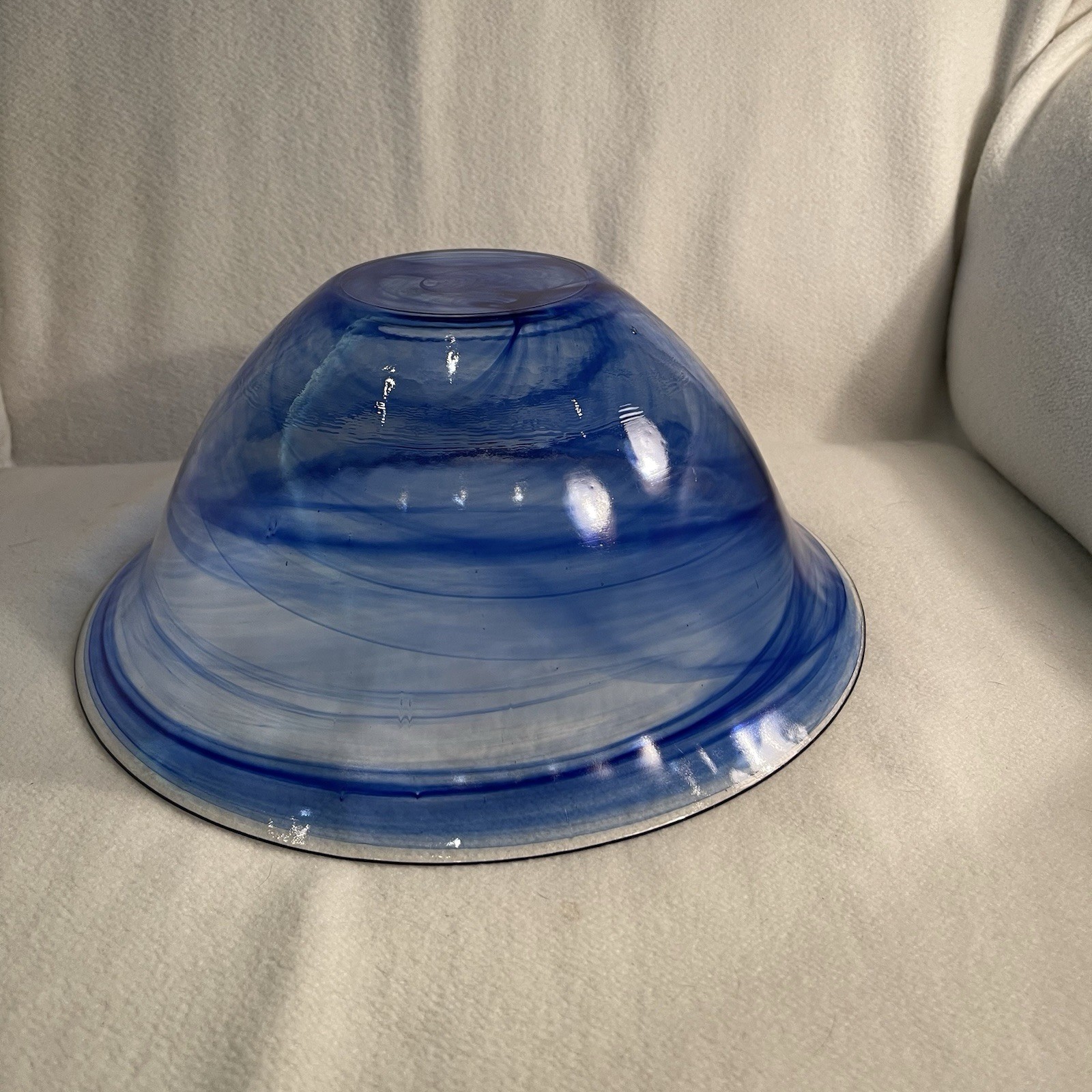 Elevate your dining experience with this exquisite Cobalt Blue Swirl Art Glass Serving Bowl. A stunning example of hand-blown glass, this piece features a mesmerizing swirl pattern in a rich cobalt blue color that is sure to add a touch of elegance to any table setting. The bowl is round in shape and measures 10 7/8" in diameter with a height of 4.5", making it perfect for serving a variety of dishes on all occasions. Crafted from high-quality glass, this decorative serving bowl is not only functional but also a beautiful piece of art that can be proudly displayed in your home. Its contemporary style and original production technique make it a unique addition to your collection. Whether you're hosting a dinner party or enjoying a quiet meal at home, this Art Glass serving bowl is sure to impress your guests. Excellent condition. No chips or cracks.