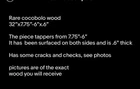 Rare cocobolo wood 32”x7.75”-6”x.6” The piece tappers from 7.75”-6” It has been surfaced on both sides and is .6” thick Has some cracks and checks, see photos pictures are of the exact wood you will receive Check our other listings for more wood. if you're looking for something specific that you don't see, i might be able to get it so send a message. I can also mill to specific sizes Shipping is free to the USA