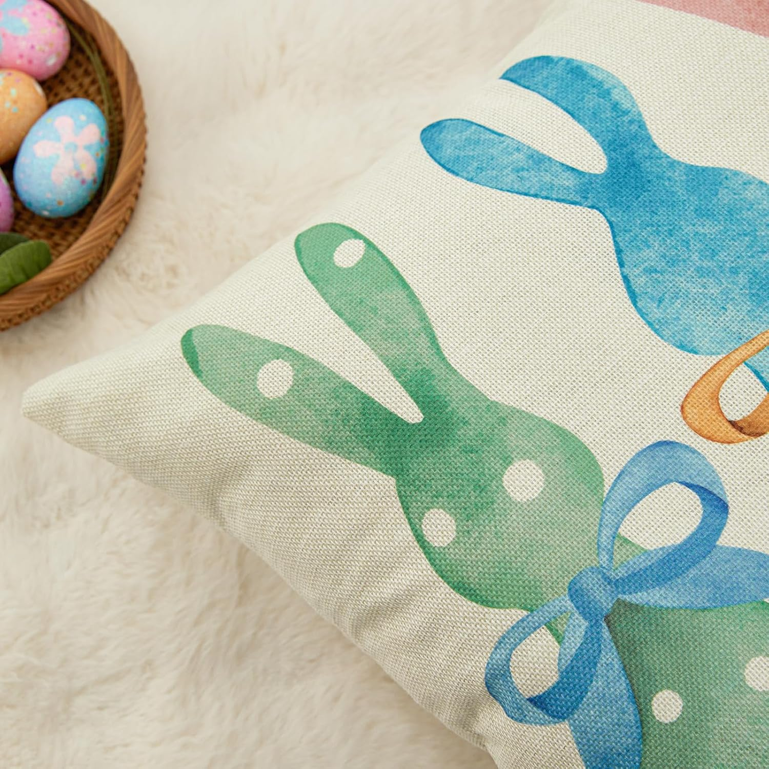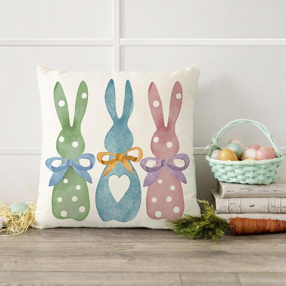 Faux Linen 100% Polyester Package includes: 2 PCS Pillow Covers(Not include Insert or filler). Pillowcases fit 20x20 inch or smaller inserts, with a printed pattern on the front.To ensure the proper fit, we make all pillow covers slightly smaller (approximately 0.5"-1" smaller) than the insert size. Indispensable Easter decorations:Featuring a bold and unique design, these Easter pillow covers are a great addition to your home decor, refreshing your room with a new and beautiful pattern, or paired with other Easter pillow covers as well as holiday decorations.It can be used both indoors and outdoors. High quality: Made of premium quality faux linen 100% polyester.The lines are uniform and fine, comfortable and soft, breathable and durable, not deformed, not easy to fade and wear-resistant. EASY TO USE: Hidden zipper closure, beautiful and practical, large opening makes it very easy to stuff pillows or stuffing into this pillowcase. Washing and maintenance: It can be washed in cold water. It only circulates gently, should not be bleached, and the color is still bright and bright as new. Product Description Easter pillow covers for home decor Perfect for Easter decorations