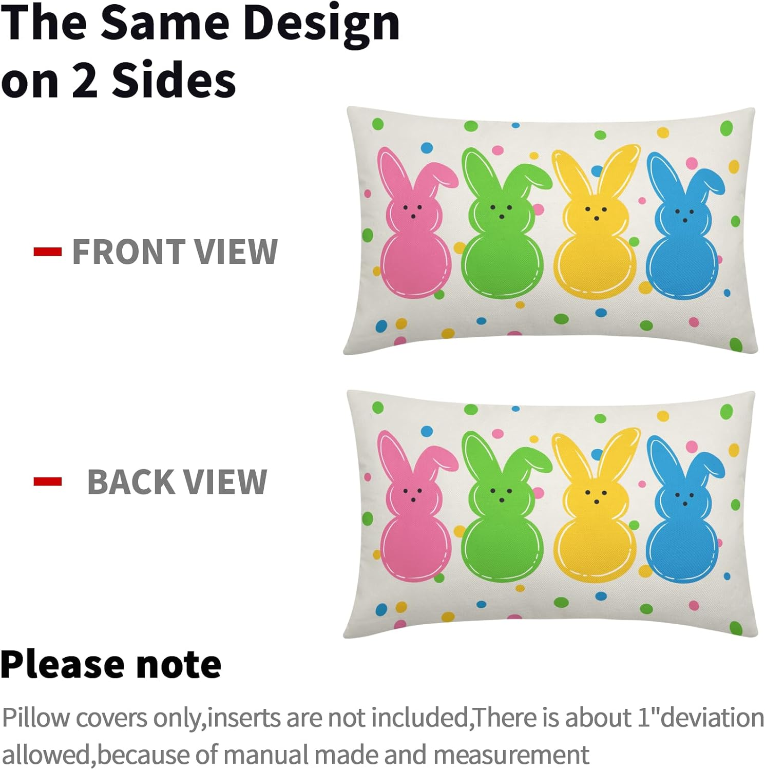 Store New Arrivals Add to Favorite View Feedback Contact GiftByRebecca has been in the US market for over 2 years and offers free delivery to the customer's home with professional customer service Easter Bunny Lumbar Pillow Covers 12X20 Inch Colorful Polka Dots Peeps Decorative Pillow Cases Set of 2 Spring Holiday Farmhouse Decor Cotton Linen Throw Pillows for Cushion Sofa Couch Porch Outdoor Description ★【Size】:12x20 inches,30x50cm,NOTE: ONLY 2 easter pillow covers contained, inserts NOT included ★【HIGH-QUALITY FABRICS】:Easter Bunny throw pillows with Colorful Polka Dots Peeps design are made of high quality cotton linen, which has an invisible zipper, double-sided printing, vibrant and cuteness design.The easter pillow covers 12x20 are comfortable and friendly to your skin or pets. no fading or abrasion, can be used outdoors. ★【EXCELLENT DESIGN】:The easter throw pillow covers are suitable for holiday decoration,the print on the pillow covers is unique and adorable.The colorful bunny pillow are sure to add bright and beautiful colors to your home decor.The easter peep pillow is definitely the best choice for Easter decoration, adding a festive atmosphere to your home now! ★【EASTER DECORATION】:The easter pillows decorative throw pillows for couch are welcome as the decorations for the Party,Bedroom,Living Room,and Garden.Perfect for decorating Chairs,Couch,Sofa,Chair,Outdoor,Patio,Beach,Cars,and Cushions. ★【CLEANING METHOD】:Separate machine wash,gentle cycle,low roll dry,do not iron,it will look new. About Us: Our company is a comprehensive home textile company that integrates design, production, and sales. We always insist on creating our products with high-quality materials and craftsmanship, which provides you with a variety of styles, colors, high-quality products to meet your diverse needs.; Product details: Pattern:double-sided printing Closure: Hidden Zip Material: High quality linen blend; Size: 12 * 20 Inches / 30cm x 50cm Color:As picture Package included:2 piece Cushion Covers without Pillow insert Features: 1.The pillow protectors with zipper are made of high quality linen blend and is very durable, environmentally friendly, and very comfortable. 2.This cushion pillowcase cover has an invisible zipper and all seams have been over-locked so it is easy to wash it. 3.Invisible zipper improves appearance and provides easy insertion and removal. Application: The easter pillow covers are worth ordering throw pillows covers for your sofa or bed. These decorative pillow covers can make a day of your physical and mental fatigue relaxed. Throw pillow cases are suitable for the living room, bed, sofa, couch, and bedroom,office,patio,porch, etc. Warm Tips 1.Please allow 1-3mm error due to manual measurement. Please make sure you do not mind before you bid. Throw pillow cover only, do not include pillow insert. 2.The colors may have different as the difference display, please understand. 3.In order to keep the color fresh, it is better to add salt to water for your first washing. Please feel free to contact us if you have any questions about this item. We will do our best to solve the problem and provide you the best service. "Add to Cart" now! Item model number Mushpillo230323 Style Modern Weave Type Linen Number of Items 2 Pattern Print Country of Origin China Theme Easter Cartoon Character Easter Bunny Number of Pieces 2 Unit Count 2.0 Count Room Type Office, Living Room, Bedroom Batteries required No Product Dimensions 20"L x 12"W Material Linen Shape Rectangular Seasons spring Closure Type Zipper Water Resistance Level Not Water Resistant Item Weight 5.6 ounces Is Euro Pillow Size No Occasion Office, Easter, Party, Outdoors, Home Special Feature Fade-Resistant Color Colorful Bunny Pillow Type Throw Pillow Recommended Uses For Product Outdoors, Home Fabric Type Linen Product Care Instructions Machine Wash Size 20" x 12" (Pack of 2) ABOUT US We offer the best prices around on high quality products. Our E-store includes media such as books, movies, music and games while offering electronics, toys, sporting apparel, clothing, tools, general home, garden items and more. SHIPPING We are always working hard to ensure your package arrives as soon as possible. Please understand that some factors like weather, high postal traffic, and the performance of shipping companies are outside of our control. We offer free shipping to the lower 48 states and ship within 2 business days of payment, usually sooner. We do not accept P.O. Boxes. Please provide a physical address. For shipping outside of the continental USA, we only use eBay's Global Shipping Program. The item is shipped to KY and then sent to the rest of the world. International customers are responsible for all duties and taxes. Continue to 'check out' to calculate costs for shipping the item to your country. Messages regarding eBay's Global Shipping Program MUST be directed at eBay EXCLUSIVELY. RETURNS We offer a 30-Day Return Policy on items in which you are not completely satisfied with. You have the option of a full-refund or an exchange of the item. No returns are available on items shipped outside of the USA PAYMENT We accept PayPal. CONTACT US This page content is yet to come Please ad us to your favorite seller and visit again later Thank You CUSTOMER SATISFACTION We try our very best to make sure every customer is completely satisfied. If there's a problem, message us! We're happy to help. WE ACCEPT