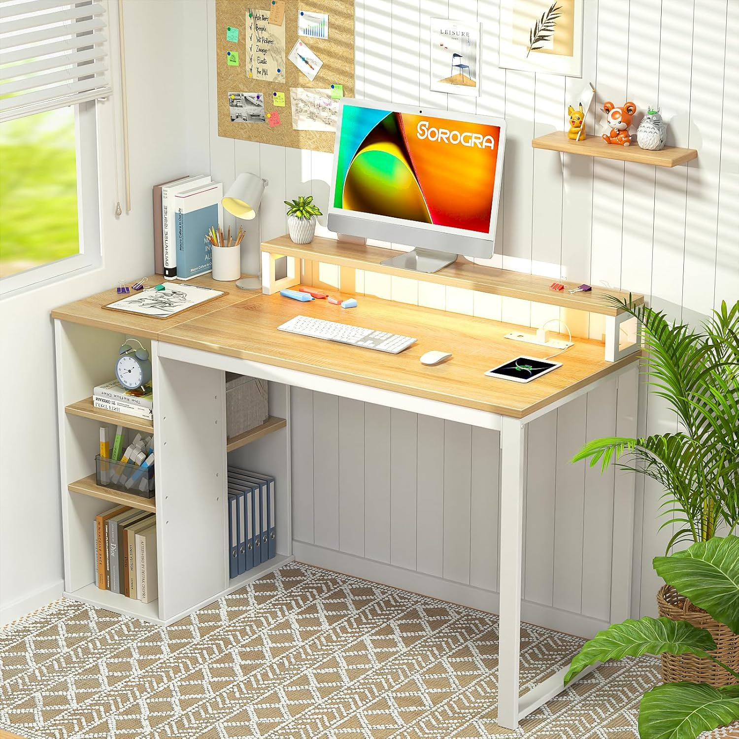 Multipurpose Storage Shelves: Two storage spaces on the side of the desk where you can change the shelving height to suit your needs Engineered for Comfort: The full monitor stand provides a comfortable viewing angle for your computer screen and protecting your neck and spine Adjustable LED Light: Integrating a thousand color variations, the desk brings dazzling light and shadow effects to your tabletop day and night Convinent Charging Design: Equipped with 3 power outlets and 2 USB charging ports, it is easy to charge your smartphone, gaming device, or bluetooth device Small Size for Limited Space: The compact size of 47.2inch fits small limited space. Perfect to be used as a writing desk, study desk, gaming desk Product Description Super Cool LED Lights with Multi-color and Brightness Stylish and Functional Small Computer Desk 1 Power Outlet 2 Monitor Stand Define Your Storage Space Minimalist and Practical Home Office Desk 1 Perfect for Bedroom 2 Home Office Desk Installation Video All necessaries and instruction are included, and please follow the video to install it. Since the desk is elaboratly designed and it might take you a little bit more time about 1 hour to finish it. 2 people to assemble is highly recommended and it will be faster to finish it if you use a electric screwdriver. The video showcases the product in use. The video guides you through product setup. The video compares multiple products. The video shows the product being unpacked. More Products in Our Store Add to Cart Add to Cart Add to Cart Add to Cart Add to Cart Add to Cart Add to Cart Customer Reviews 3.9 out of 5 stars 68 3.9 out of 5 stars 68 4.7 out of 5 stars 26,340 4.2 out of 5 stars 78 4.2 out of 5 stars 78 4.7 out of 5 stars 26,340 4.3 out of 5 stars 154 Price $139.99 $ 139 . 99 $79.99 $ 79 . 99 $79.99 $ 79 . 99 $79.99 $ 79 . 99 $79.99 $ 79 . 99 $79.99 $ 79 . 99 $69.99 $ 69 . 99 Sorogra ✔ ✔ ✔ ✔ ✔ ✔ ✔ Size 47.2"D x 18.9"W x 29.5"H 47.2"D x 18.9"W x 29.5"H 19.7"D x 39.4"W x 28.3"H 39.4"D x 18.9"W x 29.5"H 39.4"D x 18.9"W x 29.5"H 19.7"D x 39.4"W x 28.3"H 15.7"D x 31.5"W x 28.3"H Feature Open Shelves, Power Oulet, LED Open Shelves, Power Oulet, LED Foldable, Space-saving Monitor Stand, LED, Hooks Monitor Stand, LED, Hooks Foldable, Space-saving Foldable, Side Bag, Hook More Size ✔ ✔ ✔ ✔ ✔ ✔ ✔ Colors Black, Walnut, Oak, White Black, Walnut, Oak, White Black, Walnut, Oak, White Black, Brown, Oak, White Black, Brown, Oak, White Black, Walnut, Oak, White Black, Brown, Oak, White
