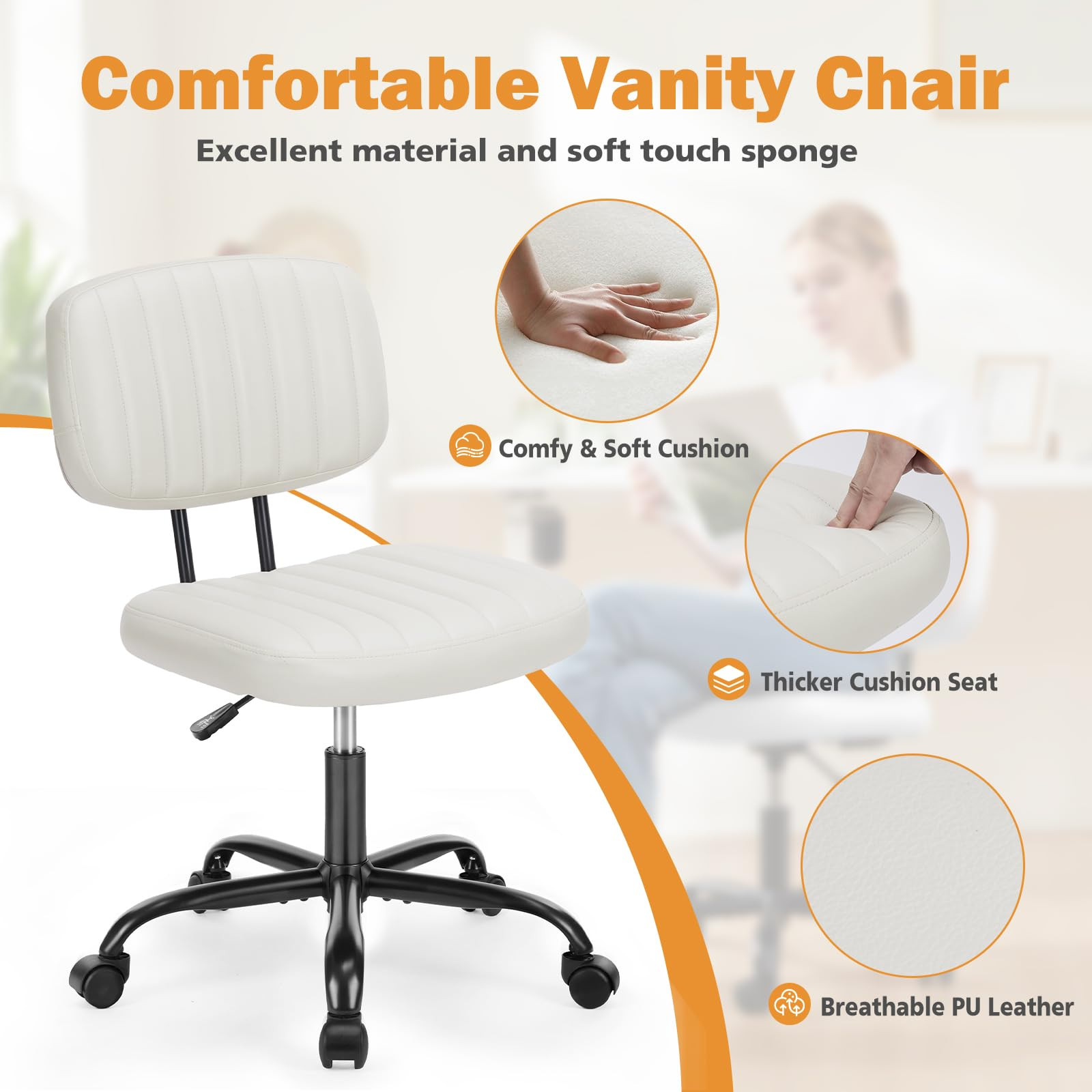 This chair is super comfy! The thick cushion and lumbar support make long hours at my desk feel effortless. The PU leather stays cool and breathable, and the armless design fits perfectly in my small space. The 360° swivel and smooth wheels let me move around easily. Great value for the price—highly recommend!
