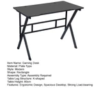 Descriptions: Wide Desktop: The large size of the desktop allows you to get rid of the boundaries and enjoy the thrill of the game, and the spacious space under the table allows you to stretch your legs to your heart's content. Super Cool Appearance: Plate type material of the entire table top, three-dimensional texture, a stronger visual sense, which makes the whole table full of fascinating luster and delicate touch. Ergonomic design, fit the curve, not tired of sitting for a long time, instantly evoke your enthusiasm for the game. And the cable holes design makes you play the game more fluent. Stable Structure: According to the physics of industrial structure design, the use of steel frame and plate type desktop, high hardness solid integral support, the desktop force evenly dispersed to the table legs, increasing the table's grip capacity, to achieve super load-bearing, coupled with adjustable feet, so that the table can be stable even on uneven ground, substantially improving the gaming experience and operation accuracy. Sturdy Outlook & Easy Assembly: K-shaped leg base design plus two beam cross-members between the legs and under the desktop, this computer desk is very sturdy. Comes with user manual to assemble. All the parts and hardware are provided and labeled. It's incredibly easy to assemble. Suitable Occasions: This PC gaming desk perfectly fits any gaming nook and bedroom space. Getting it for kids, teens, or your sweetheart and it would be cool to turn the room into a game theme. Using it as a normal study/writing/work desk will also be great. Item Name: Gaming Desk Material: Plate Type Style: Modern Shape: Rectangle Assembly Type: Assembly Required Table Leg Structure: K-shaped Table Height: 75cm Features: Ergonomic Design, Spacious Desktop, Strong Load-bearing Size Details: L: 100cm/39.37", W: 60cm/23.62", H: 75cm/29.53" (Approx.) Notes: Due to the light and screen setting difference, the item's color may be slightly different from the pictures. Please allow slight dimension difference due to different manual measurement. Package Includes: 1 x Density Board 1 x Steel Frame Tube 1 x Installation Manual Posted by eBay Mobile
