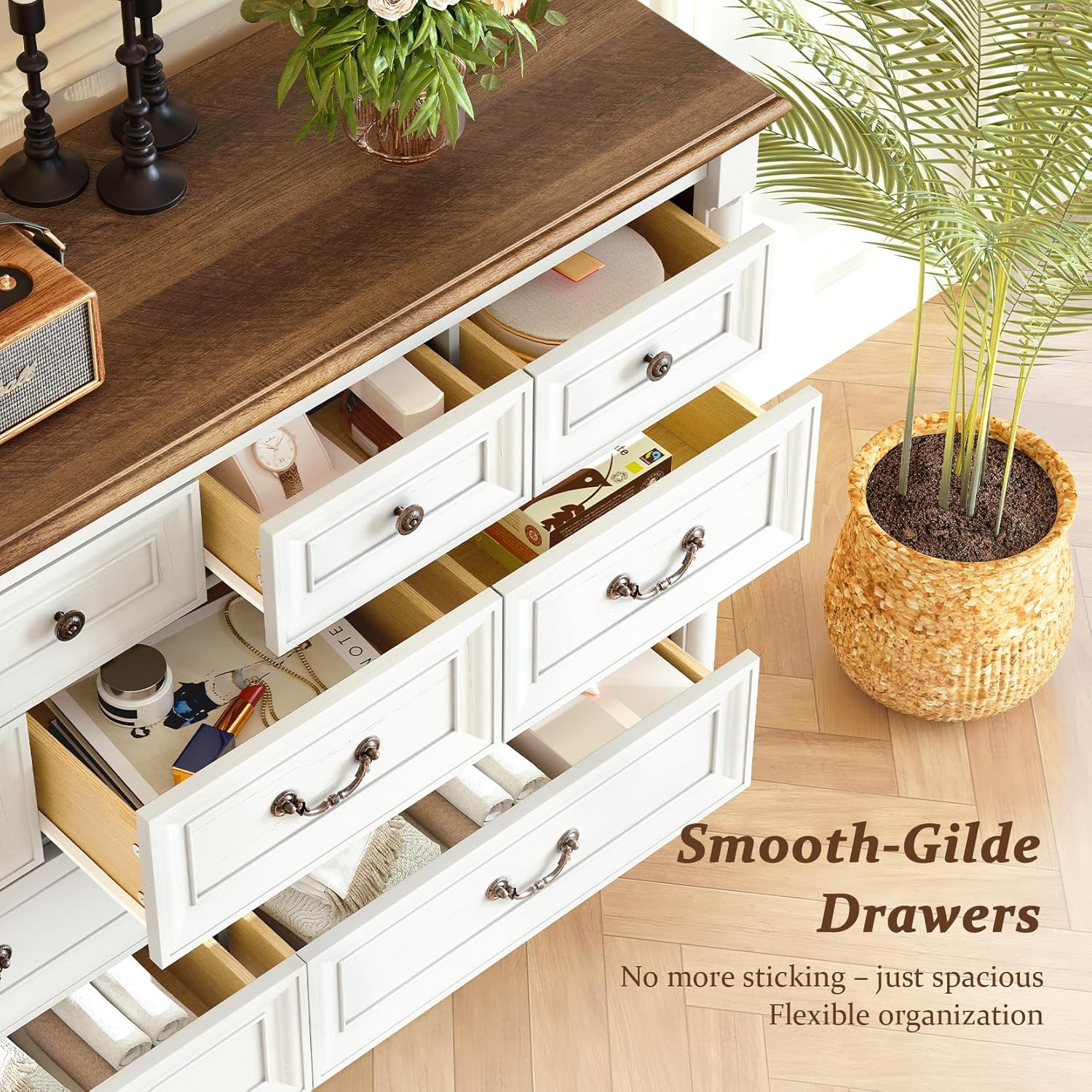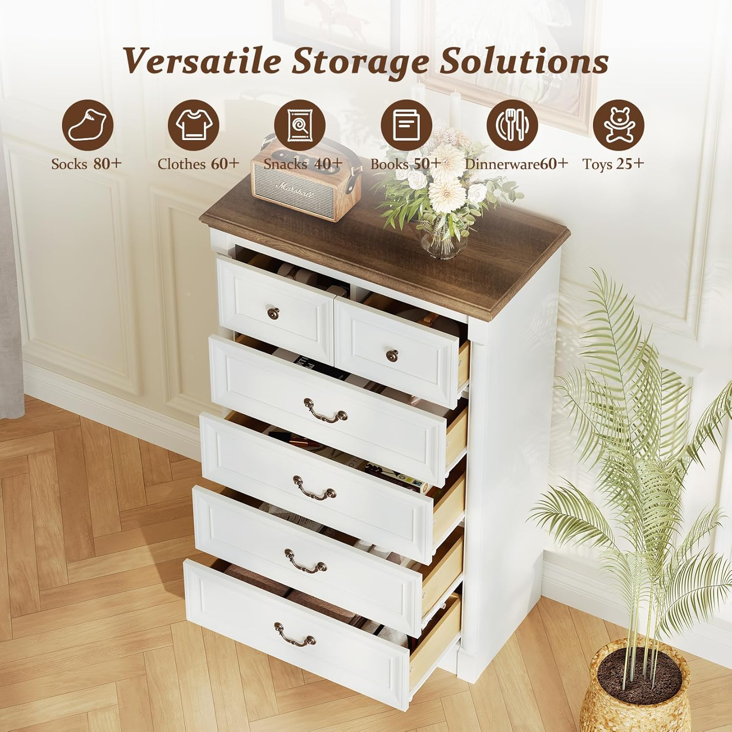 Store New Arrivals Add to Favorite View Feedback Contact Concho Farmhouse 6 Drawers Dresser for Bedroom, Tall Wood Chest of Drawers with Spacious Deep Storage Space, Rustic Storage Dressers Organizer, TV Stand for Living Room, Bedroom, Antique White Description Item model number BRF001 Room Type Bedroom, Closet, Dressing Room, Home Office, Living Room Drawer Type Side Mount Assembly Required Yes Color Antique White Brand Concho Material Wood Item Weight 91 pounds Storage Options Drawer Size 15.8"D x 31.5"W x 47.3"H (6 Drawers) Model Name BRF001 Number of Drawers 6 Number of Pieces 1 Finish Type Unfinished Product Dimensions 15.8"D x 31.5"W x 47.3"H Manufacturer Concho Spacious Storage Capacity:This 6 drawer dresser features 6 wide and deep storage drawers, perfect for neatly organizing scattered items like clothes, toys, and snacks. As one of the most practical dressers for bedroom, it also functions versatilely as an entryway table, living room decorative storage cabinet, or TV stand, making the farmhouse dresser a multi-scene storage solution Sturdy & Stable Structure:Crafted from thick wood panels, this chest of drawers boasts a 300-pound weight capacity for reliable use. Its floor-standing design without legs ensures no wobbling, while the built-in anti-tipping device prevents the wood dressers from falling over due to accidental collisions, children's climbing, or pet activity, safeguarding your family's safety Vintage Farmhouse Design:Embracing the charm of rustic aesthetics, this farmhouse dresser is adorned with retro wooden column details, brass drawer pulls, and an apple wood tabletop. These elements collectively enhance its vintage appeal, making the 6 drawer dresser a standout decorative piece that embodies the essence of farmhouse style Thick & High-Quality Material:Made of premium thick MDF boards, this farmhouse chest of drawers showcases natural wood grain on its surface. Beyond keeping clutter organized, the wood dressers seamlessly blend farmhouse retro style, serving as a unique decorative cabinet that elevates the ambiance of bedrooms, living rooms, and other spaces Reliable 6-Drawer Performance:The 6 layers of drawers in this chest of drawers stably hold daily items for storage. Its unique brass carved handles add both elegance and functionality—even when placing heavy objects, the drawers stay on track, resist deformation, and slide smoothly without obstacles, ensuring long-lasting use of the 6 drawer dresser Comprehensive Assembly Support: This chest of drawers is shipped unassembled in a single package for convenient transportation. To address any issues you may encounter during assembly, we provide both paper and electronic versions of the instruction manual, along with a complete installation video tutorial. If you run into any unsolvable problems while putting together this modern bedroom dresser, please don't hesitate to contact us for assistance Product description ABOUT US We offer the best prices around on high quality products. Our E-store includes media such as books, movies, music and games while offering electronics, toys, sporting apparel, clothing, tools, general home, garden items and more. SHIPPING We are always working hard to ensure your package arrives as soon as possible. Please understand that some factors like weather, high postal traffic, and the performance of shipping companies are outside of our control. RETURNS We offer a 30-Day Return Policy on items which you are not completely satisfied with. You have the option for a full-refund or an exchange of the item. No returns are available on items shipped outside of the USA. PAYMENT We accept PayPal. CONTACT US This page content is yet to come Please ad us to your favorite seller and visit again later Thank You CUSTOMER SATISFACTION We try our very best to make sure every customer is completely satisfied. If there's a problem, message us! We're happy to help. WE ACCEPT Copyright © 2021 AutoDS. | All Rights Reserved