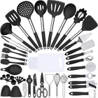 Silicone Cooking Kitchen Utensil Set, Umite Chef 43 PCS Heat Resistant Kitchen Utensils Gadget Set-Stainless Steel Handle- Kitchen Spatula Tools for Nonstick Cookware, Kitchen Accessories(Black) 43 PCS COOKING UTENSIL SET - 43 multifunction utensil set includes everything you need to cook that perfect dish,includes Slotted Turner,Slotted Spoon, Solid Turner, Deep soup Ladle, Pasta Server, Flexible Spatula, Spoon Spatula, Spreader Spatula, Slotted Spatula, Bating Brush, Egg Whisk, Slotted Spoon, Solid Spoon, Kitchen Tongs, Cheese Grater, Peeler, Pizza Turner and so,Your smart purchase of our all-inclusive and essential kitchen gadgets set is one you'll appreciate for many years HARD WEARING LASTS A LIFETIME: One- piece stainless steel core to enhance durability and toughness to keep them from bending chipping, warping or other deformation. top-grade 304 stainless steel and durable silicone durable than wooden or bamboo, not bend like plastic utensils or break like wooden utensil tools. You no more waste of money to replace inferior kitchenware frequently. Great presents for anyone who loves to cook, also a good gift set for your friends and family HEAT-RESISTANT, NON-STICK, NON-MELTING - The Silicone Cooking Utensils can withstand high temperatures up to 446°F/230°C. They will not melt or produce smoke like poor quality plastic utensils even if used in a high-temperature frying environment. Effortlessly cook the foods you want, no longer worry food will stick your cookware steel material, also prevent from chipping, warping ,melting or any other damages. Utility hanging hole on each handle for convenient storage organization FOOD GRADE EASY TO CLEAN: Our heat resistant silicone utensils is made of all in best quality materials. Nontoxic, Environment-friendly, BPA Free, Lead Free, allowing for healthy cooking while protecting your coated cookware. All-around silicone added to the softness, which protect your pans, keep the cookware surface not scratched or dented. One-piece molding without any gaps to capture food. Make cleaning easier, Simply put these utensil in the water to wash off any grease or oil GREAT PRESENTS SET This kitchen utensil set comes with everything you need to get started cooking. A utensils holder can help you organized your kitchen tools well. If you moving or just need a new set of cooking utensils highly recommended. Perfect for house warming presents, wedding presents, mother's day presents, holiday presents and anyone else on your presents list