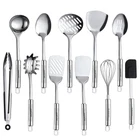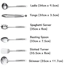 A PERFECT CHOICE FOR YOUR KITCHEN - Whisk (30.5cm x 7cm) /Spatula (30cm x 5cm) /Spaghetti Server (35cm x 8cm) /Asla Turner (35.5cm x 8cm) /Non-Slotted Turner (35cm x 10cm) /Slotted Turner (35.5cm x 8cm) /Skimmer (35cm x 11.7cm) /Slotted Serving Spoon (33cm x 7.5cm) /Basting Spoon (33cm x 7.5cm) /Ladle (34cm x 9.5cm) /Tongs (30cm x 3.5cm) /A Gift Box SPLENDID STAINLESS STEEL - Each metal kitchen utensilt is crafted with high-quality & friendly materials, high grade stainless steel is absolutely safe and will faithfully serve you for years. This kitchen utensils set is a must-have for every kitchen! DURABLE, STURDLY & COMFORTABLE - These kitchen gadget set are made to stand the test of time.Our high-quality stainless steel cooking utensils are polished with a special oil to prevent it from getting rusty. They are dishwasher safe, light weight and non-stick. COMFORTABLE HANDLE - Enough length prevent your hand from scalding.Also,special design make you feel comfortable for many hours of pleasant cooking.A hole in th perfect handle makes it convenient to store. BEST COOKING UTENSIL GIFT - Classic silver look goes with any kitchen boasts the largest variety of utensils, making it ideal for new homeowners , stylish cookware set is the ideal housewarming gift Christmas gift or wedding gift for newlyweds. Not only can you meet your daily needs, but also share with your friends!