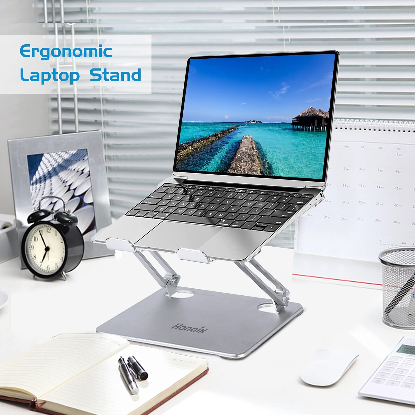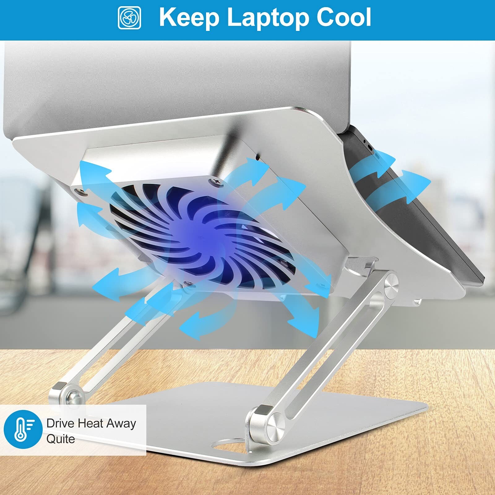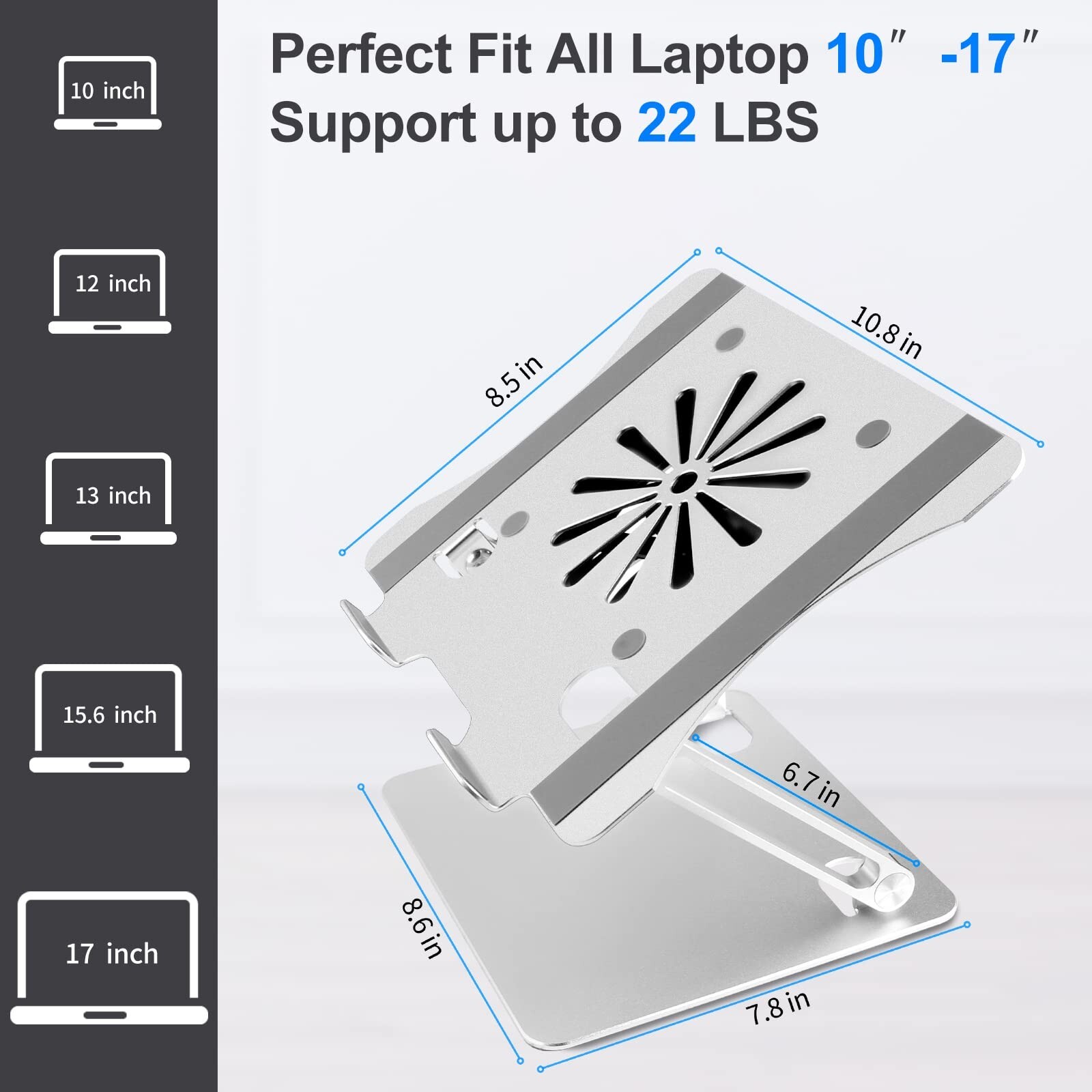 Laptop Stand with Fan, Laptop Riser Computer Stand for Laptop Foldable & Height Adjustable, Compatible with MacBook Air Pro, Dell, HP, Notebook 10-17.3” Sliver Product Details Brand: Hanaix Color: Silver Form Factor: Tower Compatible Devices: MacBook, Notebook, Tablets, Laptops Compatible Phone Models: all Brand: Hanaix Item Weight: 2.55 pounds Package Dimensions: 11.5 x 9.76 x 2.24 inches Color: Silver Manufacturer: Hanaix Country of Origin: China Date First Available: December 17, 2020 Ergonomic Adjustable Laptop Stand With Fan: This holder with Z-type dual axle design adjust your laptop perfectly match your eyes level to fix sitting posture, save you from neck shoulder back pain caused by hunchback working. And the riser is stable enough not to wobble even typing on the laptop keyboard, you will more focused on getting your work or study done. Free Noise Laptop Cooling Fan: Besides the metal holder heat conduction, the laptop holder built-in 14cm diameter cooling fan. Pull in cool air and disperse the heat around so that your laptop stays cool it's equal to a laptop cooling pad in hot day, and there's no any annoying noise. Wide Suitable for Most Laptop: The laptop riser fits all laptops from 10-17 inches. Such as MacBook 12/ 13 MacBook Air 13 Macbook Pro 13/ 15/ 17 Google Pixelbook Dell XPS HP ASUS ThinkPad Acer Chromebook and other notebook Pad models. Stable and Foldable: Macbook stand made with premium aluminum alloy and unique shaft design, provided the computer stand more stable, which support up to 22 lbs, no worry any wobble. And rubber mats and feet protect your devices from scratches and sliding on your desk.Foldable to save space for easy storage and easy for carrying out. Multi Use: Laptop cooling stand fit well to your home and office. such as meeting room, kitchen and music playing house to hold the laptops, tablets, projectors, menu, music books, magazines etc. An excellent gift for your friends and family.