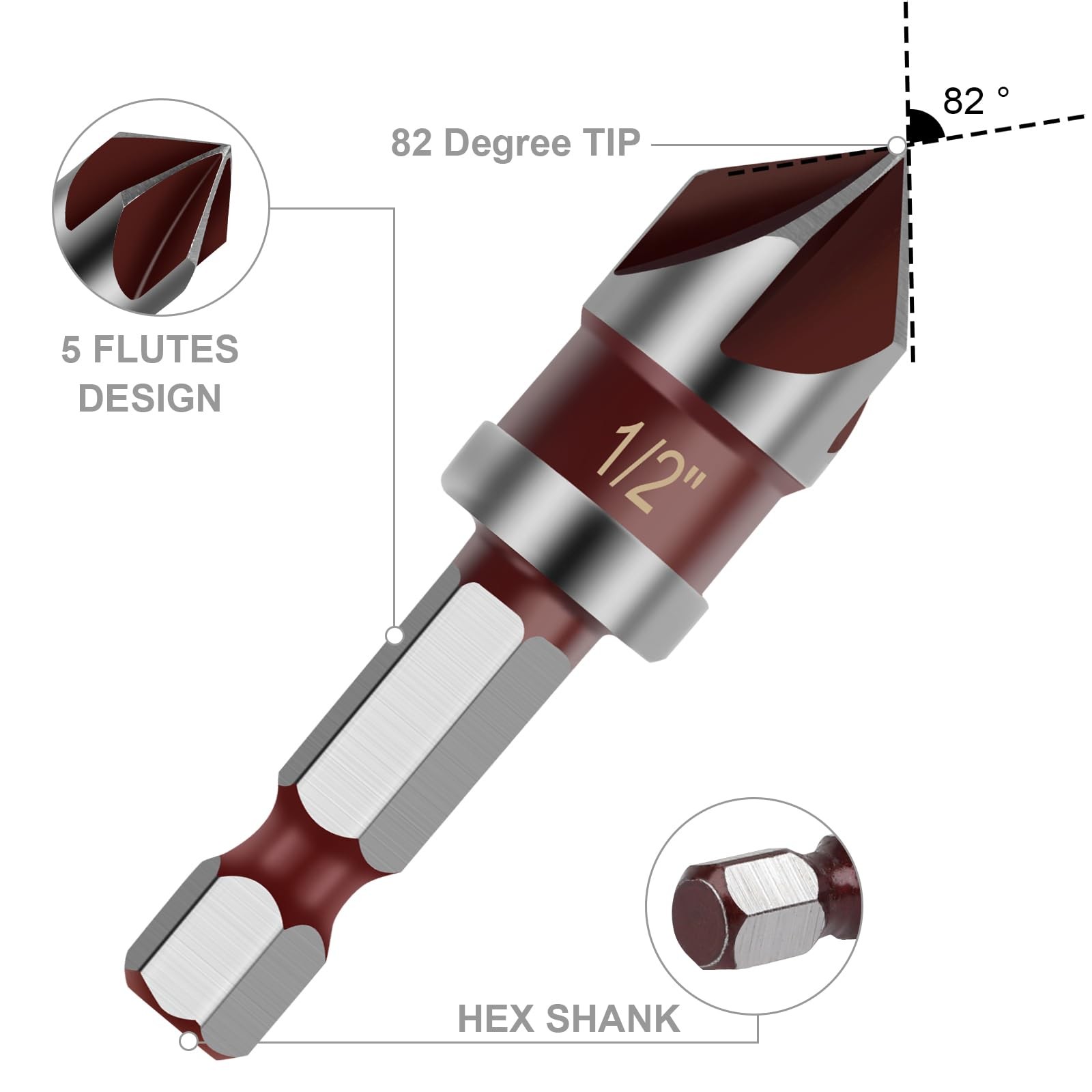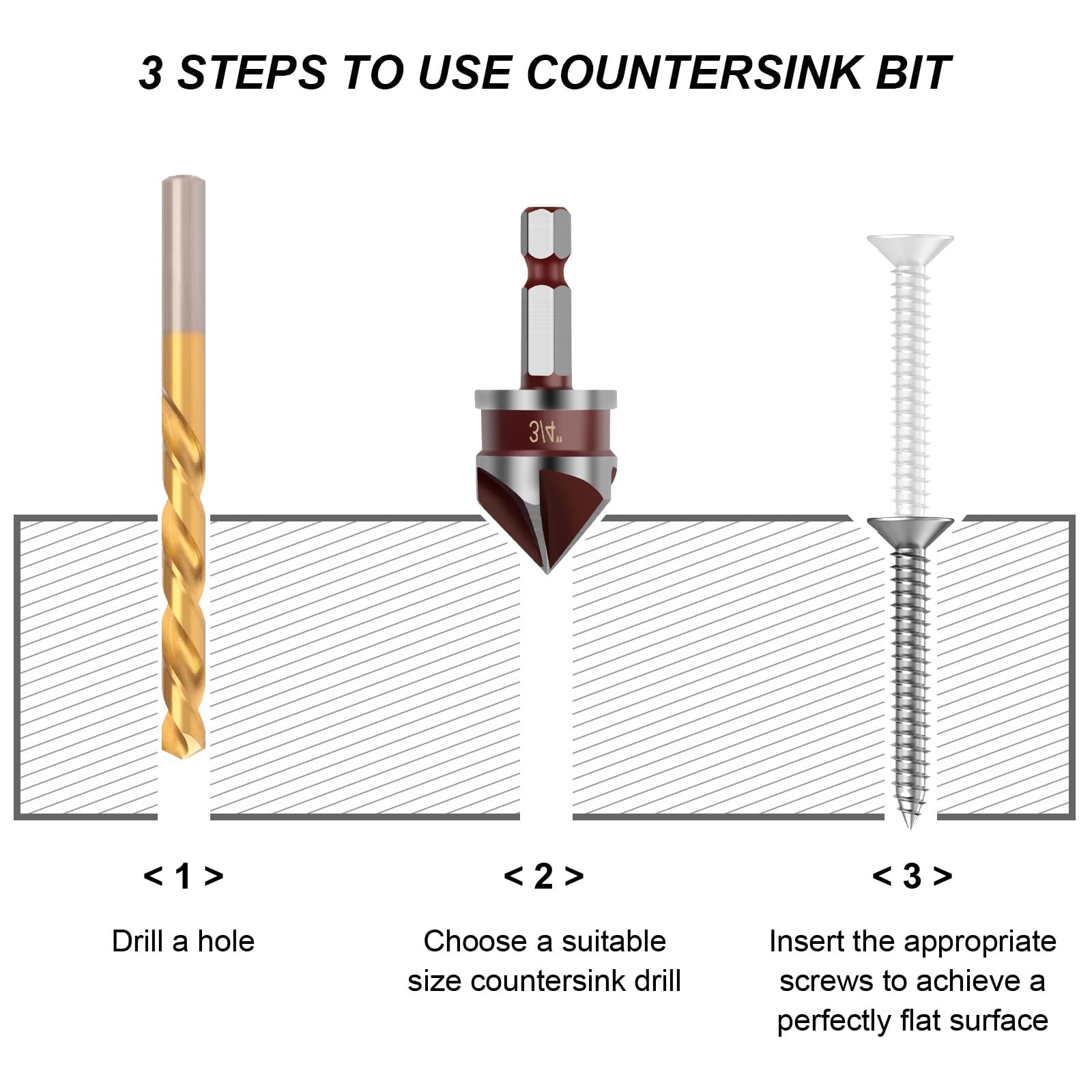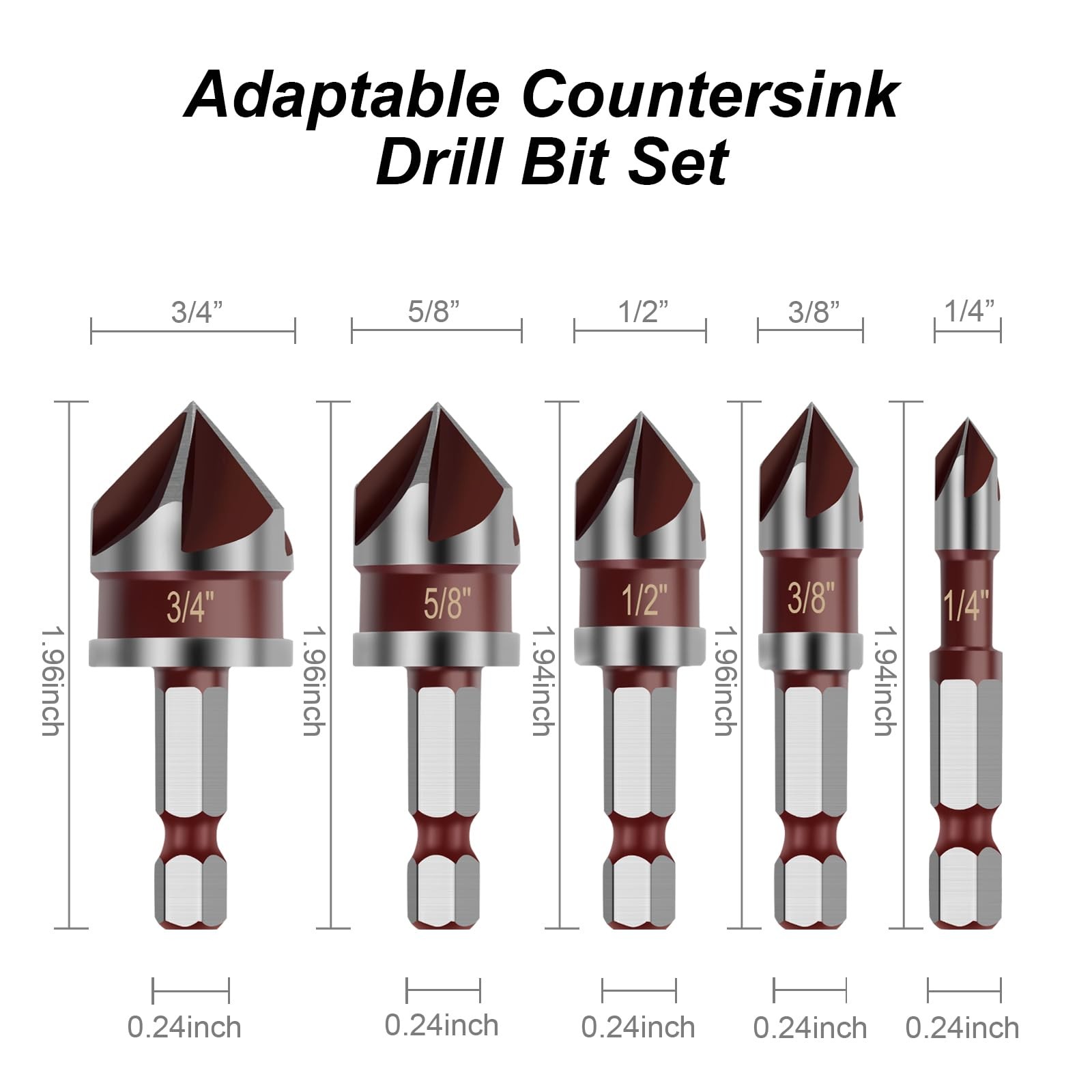 Countersink Drill Bit, 5PCS 82 Degree HSS 1/4"-3/4" with 1/4" Hex Shank Countersink Drill Bit Set, Counter Sink Drill Bit for Wood, Metal, Plastic, Countersink Bit for Woodwork Product Details Adaptable Countersink Drill Bit Set:This 5-piece counter sink drill bit set includes sizes 1/4”, 3/8”, 1/2”, 5/8”, and 3/4”, featuring an 82-degree angle tip designed to drill precise countersink holes in wood, metal, plastic, and other materials. Important: DO NOT USE these countersink drill bits for processing STAINLESS STEEL or IRON PLATES. Precision Countersink Drill Bits:Each counter sink drill bit features 5 sharp flutes and a precisely ground 82° angle, delivering fast, smooth screw recessing in all workpiece types. An excellent choice for woodworking、metal projects and versatile material applications. Quick-Change Shank Design:Engineered for countersink drill bit sets, this 1/4" hex shank countersink drill bits quick-change shank in seconds. Seamlessly compatible with handheld drills, impact drivers, and drill presses – no chuck adjustment required. Organized Storage Case:This counter sink drill bit set comes with a custom-molded compact case featuring bit-specific slots to keep countersink bits securely organized and protected. Ideal for workshop-to-jobsite portability while extending tool lifespan. Engineered for Longevity:Crafted from high-speed steel, this counter sink drill bit set delivers exceptional heat resistance and wear tolerance for maximum lifespan. Maintenance Tip: Apply cutting oil after each use to prevent corrosion and maintain peak performance.