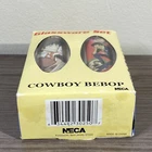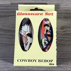 This is a NECA glassware set featuring characters from the anime series Cowboy Bebop. The set includes four 4-inch shot glasses with designs of Spike Spiegel and Faye Valentine. The glasses were manufactured in 2002 and are made of glass. They are part of the Sunrise and Dark Horse franchises and are perfect for fans of the Cowboy Bebop TV show and comic books.