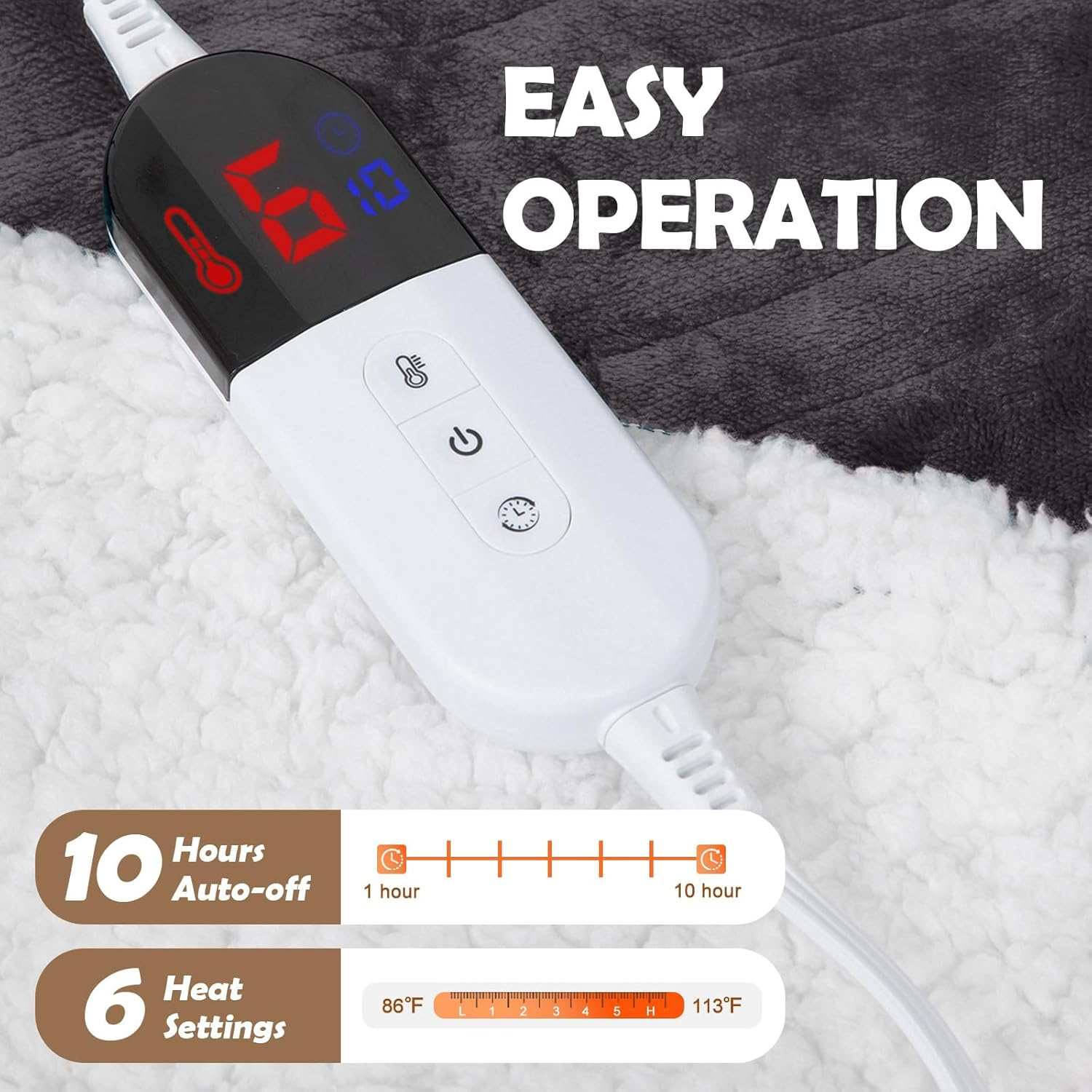 Customizable Comfort: The electric blanket features 6 heat settings, allowing you to adjust the warmth to your personal preference. Equipped with a 10-hour timer, this blanket offers worry-free use. Simply set your desired tempurature and time and the heated blanket will automatically shut off after the set period. Luxurious Materials: Our Heated Blanket is crafted from a premium blend of flannel and sherpa fleece. The flannel provides a smooth and soft surface, while the sherpa fleece adds a thick, insulating layer, making it incredibly soft and cozy to snuggle up in. Versatile Use: This Heated Blanket is not just for keeping warm. It perfect for lounging on the couch, snuggling in bed, or even using as an extra layer of warmth on cold winter nights. Its stylish design also adds a touch of elegance to any room. Safe & Reliable: Safety is our top priority. That's why our Heated Blanket is designed with an auto shut-off feature. This means even if you forget to turn it off, the blanket will automatically shut down after the timer expires, providing peace of mind while you rest. Machine Washable: This heated blanket is completely machine washable. Simply remove the plug and throw the blanket in the washing machine. ( Wash at a maximum of 40℃/104℉) Product Description The video showcases the product in use. The video guides you through product setup. The video compares multiple products. The video shows the product being unpacked. Choose the One That Suits You Best! Add to Cart Add to Cart Add to Cart Add to Cart Add to Cart Customer Reviews 4.7 out of 5 stars 114 4.7 out of 5 stars 114 4.7 out of 5 stars 114 4.7 out of 5 stars 114 4.7 out of 5 stars 114 Price $39.99 $ 39 . 99 $59.99 $ 59 . 99 $69.99 $ 69 . 99 $89.99 $ 89 . 99 $99.99 $ 99 . 99 SIZE 50" x 60" 62" x 84" 72" x 84" 84" x 90" 90" x 100" COLOR Gray & Blue Gray & Blue Gray & Blue Gray & Blue Gray & Blue HEAT SETTINGS 6 6 6 6 6 AUTO-OFF TIMER 4 10 10 10 10 MATERIAL Flannel & Sherpa Flannel & Sherpa Flannel & Sherpa Flannel & Sherpa Flannel & Sherpa MAINTENANCE Dry-Cleaning / Machine Wash Dry-Cleaning / Machine Wash Dry-Cleaning / Machine Wash Dry-Cleaning / Machine Wash Dry-Cleaning / Machine Wash