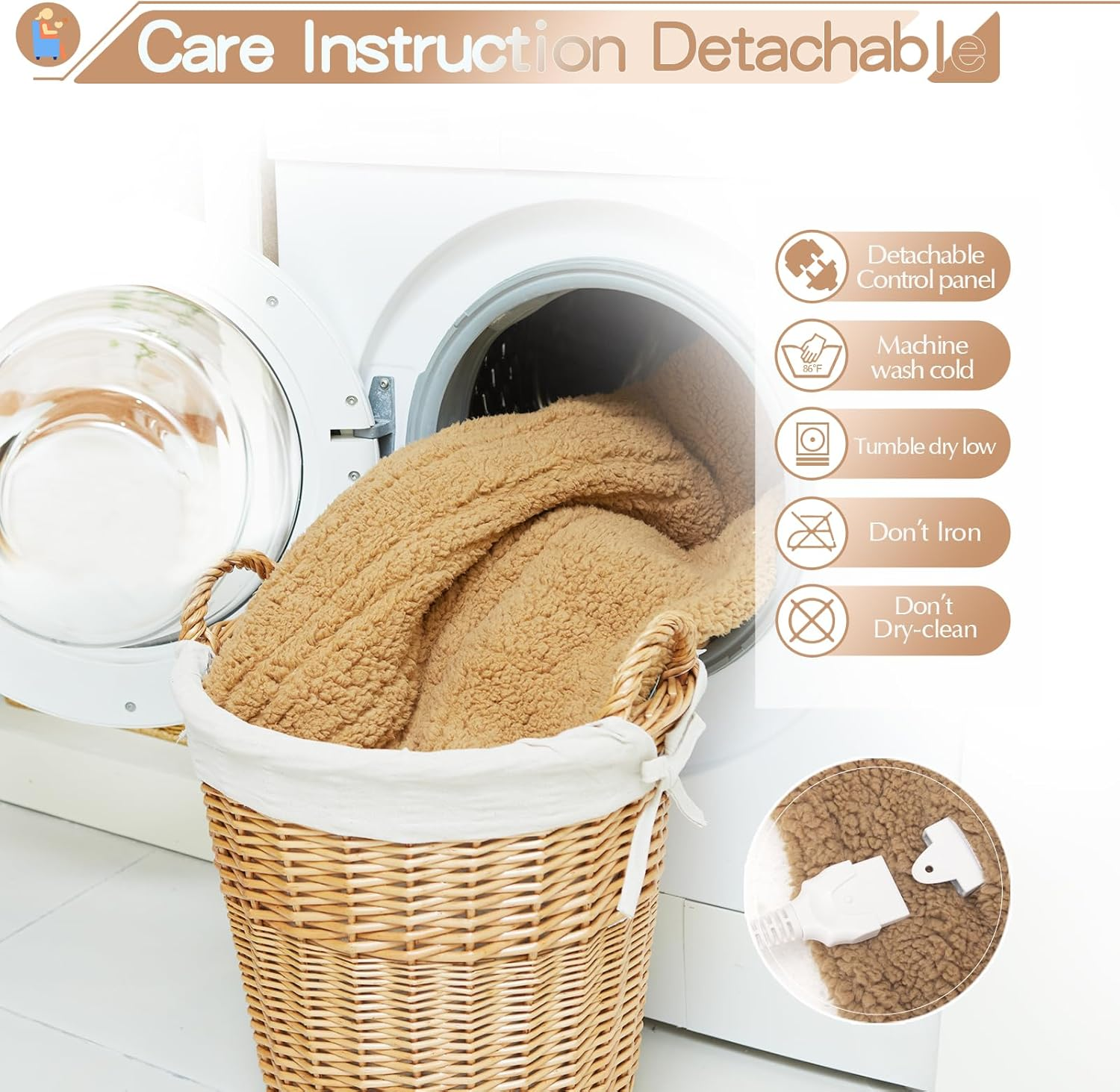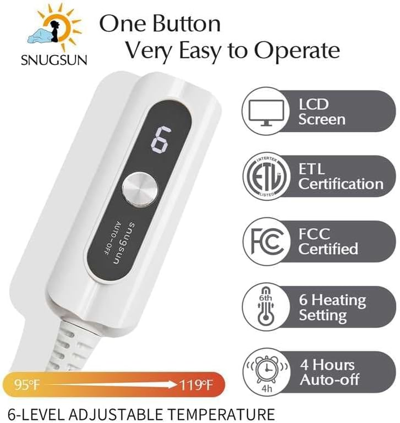 FAST HEATING & SAFETY FIRST: Heated throw blanket can quickly heat up within 10 minutes, allowing you to feel warm quickly. The quality and safety of our heated blanket is ETL & FCC certified. Overheat protection and short-circuit protection design let you use with peace of mind. SOFT & COZY FABRIC: The silky flannel fabric on the outside of the electric throw blanket gives you a skin-friendly feeling, while the fluffy sherpa on the inside gives you double the warmth. You can not only feel cozy with combination of two fabric, but also better lock in warmth. SIMPLE USAGE & AUTO OFF: One button to turn it on and then choose your customized temperature(95-119°F) from 6 heating levels. The 50"x60" heated throw automatically shuts down after 4 hours and the 62"x84" electric blanket automatically shuts down after 10 hours. Our heated blanket throw is ideal for your lunch break and night sleep. EASY TO CARE & CARRY: Machine washable features make it last longer without lint and color fading(Please detach the controller before washing). The weight of 50"x60" electric blanket throw is only about 1kg, which is convenient to carry out for camping and traveling. LEXIBLE & CONVENIENT: The upgraded design of this heating blanket throw makes only one end of the hand control connected to the powercord (10 feet). Compared with connecting the power cord at both ends, you can feel a kind of flexibility without restraint. Product Description The video showcases the product in use. The video guides you through product setup. The video compares multiple products. The video shows the product being unpacked. 1 IN BED 2 ON SOFA 3 AT WORK
