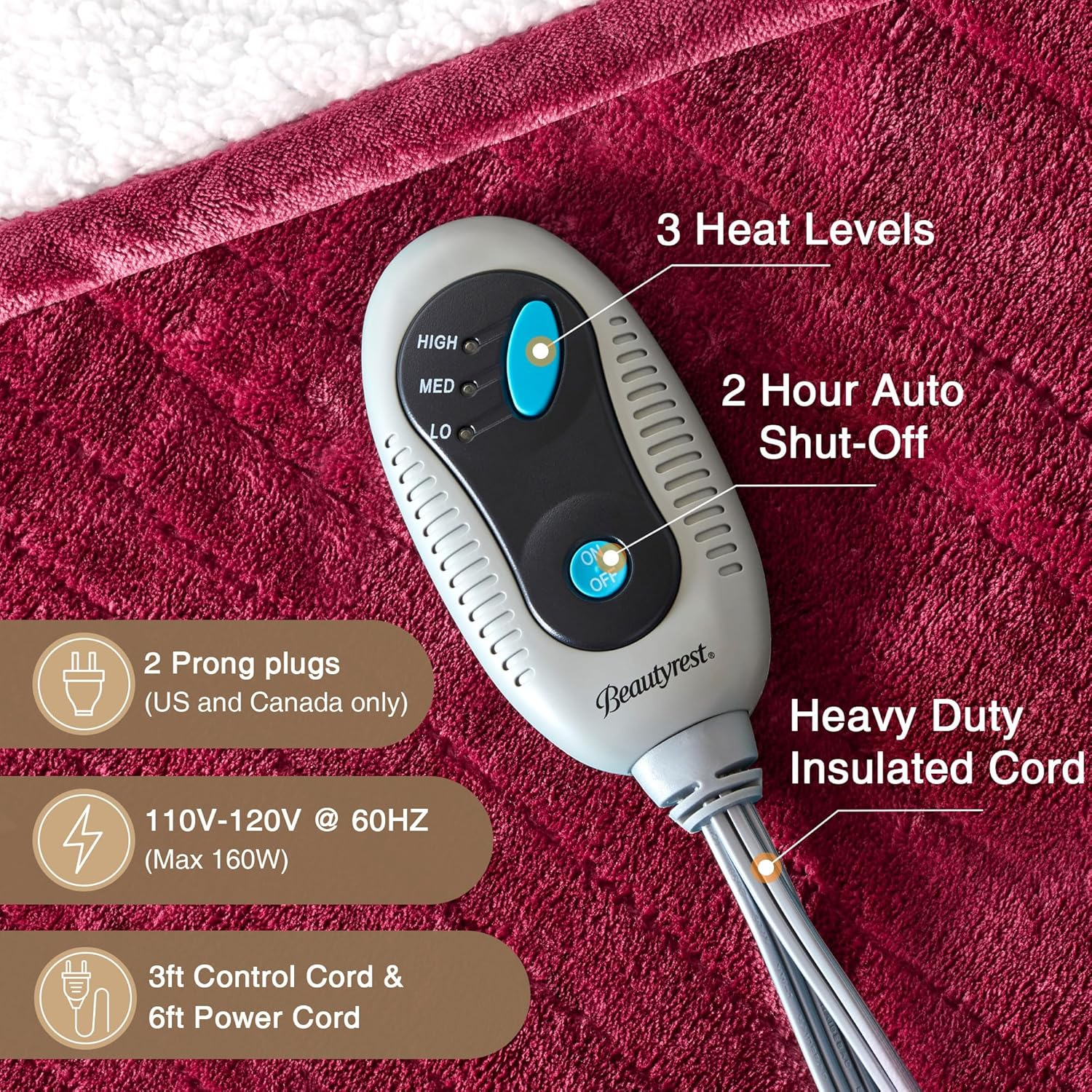 Store New Arrivals Add to Favorite View Feedback Contact Heated Blanket, Eletric Throw Blanket, Soft, Warm, Reversible Plush - Sherpa Heating Blanket Throw for Office, Couch, 3 Heat Settings, 2 Hr Auto Shut Off, Machine Washable, 50 X 60 Red Description Item model number BR54-4847 Style Modern Number of Items 1 Pattern Solid Country of Origin China Blanket Form Single Layered Blanket Theme Cloudlike Unit Count 1.0 Count Batteries required No Product Dimensions 60"L x 50"W Material Sherpa Age Range (Description) Adult Seasons Winter Included Components 1 Throw:50"W x 60"L Item Thickness 0.25 Inches Model Name Heated Microlight to Berber Water Resistance Level Not Water Resistant Fabric Type Sherpa Item Weight 3.15 pounds Special Feature Reversible, Heated, Electric Fabric Warmth Description Heavyweight Color Red Recommended Uses For Product Reading, Napping Product Care Instructions Machine Wash Size 50x60" Sherpa Beautyrest - An American company with 16+ years of experience and zero product recalls. Each product undergoes 78 independent safety tests, surpassing industry standards and exceeding UL requirements for superior reliability Premium - Made from 200gsm plush & 220gsm sherpa, softer and thicker than standard blankets. It's warmer even without electricity, durable, and resistant to shedding. Evenly spaced & soft heating wires deliver heat evenly for consistent warmth & comfort Energy Saving - Stay warm and cozy while keeping electricity costs low. Our heated throw offers targeted heating on individual without raising your entire home's temperature. Oeko-Tex certified for the highest quality, ensuring both comfort and wellness Perfect Gift for Any Occasion - Luxuriously cozy plush heated throw, a sherpa reverse. 3 heat setting delivers adjustable heat from 85 - 105℉ (depending on the surrounding temperature). For added safety & convenience, it includes a 2-hr auto shut-off Easy to Use - Ample coverage 50 in x 60 for personal comfort & conveniently machine washable, simply unplug it and toss it into the wash . Confidently carry 5 year warranty. DO NOT LEAVE CONTROLLER COVERED WHEN IN USED TO AVOID OVERHEATING Immerse yourself in comfort in the BeautyRest Heated Microlight reverse to Berber Throw. This heated throw utilizes state of the art Secure Comfort technology that adjusts the temperature of your blanket based on overall temperature, spot temperatures and the ambient temperature of your room, ensuring a consistent flow of warmth. This unique technology also emits virtually no electromagnetic field emissions, so you can snuggle up with confidence. This throw provides ample coverage for personal targeted heating without raising your entire home's temperature. The ultra soft microlight plush fabric combines with billowy berber in this cozy, comfortable throw. Features 3 heat settings and 2 hour auto shut off. This throw is machine washable for easy care and OEKO-TEX certified, meaning it does not contain any harmful substances or chemicals to ensure quality comfort and wellness. Includes manufacturer’s 5-year warranty. ABOUT US We offer the best prices around on high quality products. Our E-store includes media such as books, movies, music and games while offering electronics, toys, sporting apparel, clothing, tools, general home, garden items and more. SHIPPING We are always working hard to ensure your package arrives as soon as possible. Please understand that some factors like weather, high postal traffic, and the performance of shipping companies are outside of our control. We offer free shipping to the lower 48 states and ship within 2 business days of payment, usually sooner. We do not accept P.O. Boxes. Please provide a physical address. For shipping outside of the continental USA, we only use eBay's Global Shipping Program.The item is shipped to KY and then sent to the rest of the world. International customers are responsible for all duties and taxes. Continue to check out in order to calculate costs for shipping the item to your country. Messages regarding eBay's Global Shipping Program MUST be directed at eBay EXCLUSIVELY. RETURNS We offer a 30-Day Return Policy on items which you are not completely satisfied with. You have the option for a full-refund or an exchange of the item. No returns are available on items shipped outside of the USA. PAYMENT We accept PayPal. CONTACT US This page content is yet to come Please ad us to your favorite seller and visit again later Thank You CUSTOMER SATISFACTION We try our very best to make sure every customer is completely satisfied. If there's a problem, message us! We're happy to help.