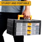 Craft Organizer with Drawers: Specially designed and Ideal for storing and carrying tools and craft items, this portable plastic toolbox has an impact-resistant construction of great value. The size of this craft organizer is ideal and will take the optimal room in your work cabin or closet. Nice Quality and Durable: Constructed from durable, high-impact polypropylene, this case will be your favorite and long-lasting option for all your storage needs. The transparency of the drawers provides great convenience for the visibility of the contents of each drawer. Sturdy and Portable: With its convenient carrying handle, this organizer is easily portable and travel-friendly. Just take it whenever and wherever it is needed. An extra compartment on the top part is also maximizing its storage capacity. Multi-Purpose Functionality: This excellent multi-purpose storage case is perfect for everything from small tools and hardware such as nails, screws, pins, and bolts, to fishing tackle, beads, jewelry, and crafting material! It is simply the master key solution for all storage problems.