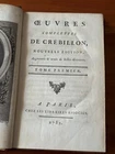 Crebillon (Prosper Jolyot de). Oeuvres complettes de Crébillon, Nouvelle édition, Augmentée & ornée de belles gravures. A Paris, chez les Libraires Associés, 1785. Trois volumes in-8. Faux-titre, frontipice gravé par Marillier d'après de La Tour, titre, avertissement, LXXVI (préface et éloge), 285 pp. - Faux-titre, titre, 375 pp. - Faux-titre, titre, 333 pp. Les trois volumes sont ornés de 9 gravures hors-texte deMarillier. Exemplaire en plein maroquin rouge, triple dentelle dorée sur les plats, dos lisse orné de caissons fleuris, pièces de titre et de tomaison de maroquin , toutes tranches dorées. Bel exemplaire malgré un des mors du tome 2 fendu. Poète tragique français (1674-1762), Crébillon fut une grande figure de son temps. Il tient sa place dans l'histoire de notre théatre. Il se croyait l'héritier de Racine : en fait il marque plutôt la fin de la tragédie classique, en confondant violence et grandeur, en substituant à la simplicité racinienne sa prédilection pour les complications de toutes sortes, méprises, reconnaissance, naufrages, catastrophes.