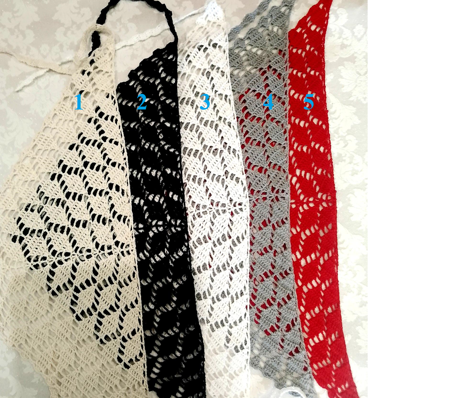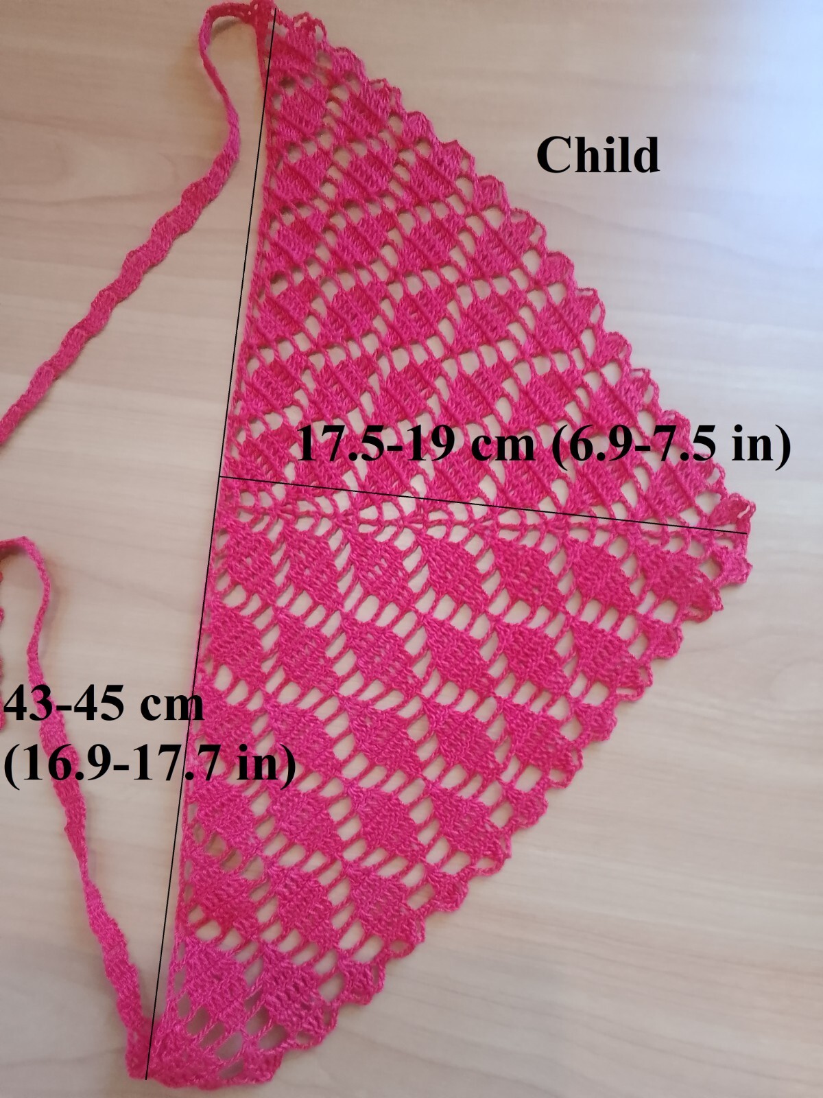Material: 100% natural cotton Delicate and lightweight structure Universal size fits all body types Available in a variety of colors This crochet bandana scarf is the perfect addition to your summer wardrobe. It will enhance your individuality and keep you comfortable at any time of the day. Available in two sizes: Adult: 51-55 cm x 20.5-23 cm (depending on yarn color) Child: 43-45 cm x 17.5-19 cm