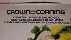 Crown Corning Glass Works Centrix 5 Piece Salad Set / In Very Good Preowned Condition. Box shows signs of wear/damage. 1-10" 4 quart Bowl 4- 6" 24 ounce Bowls Original Box
